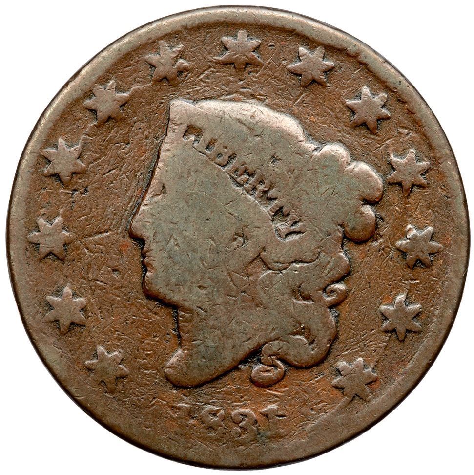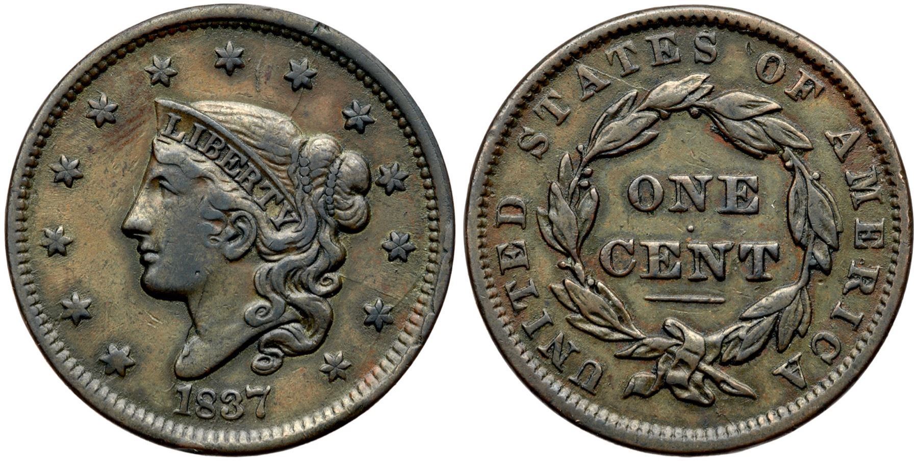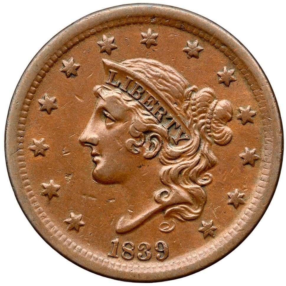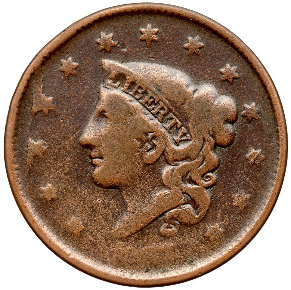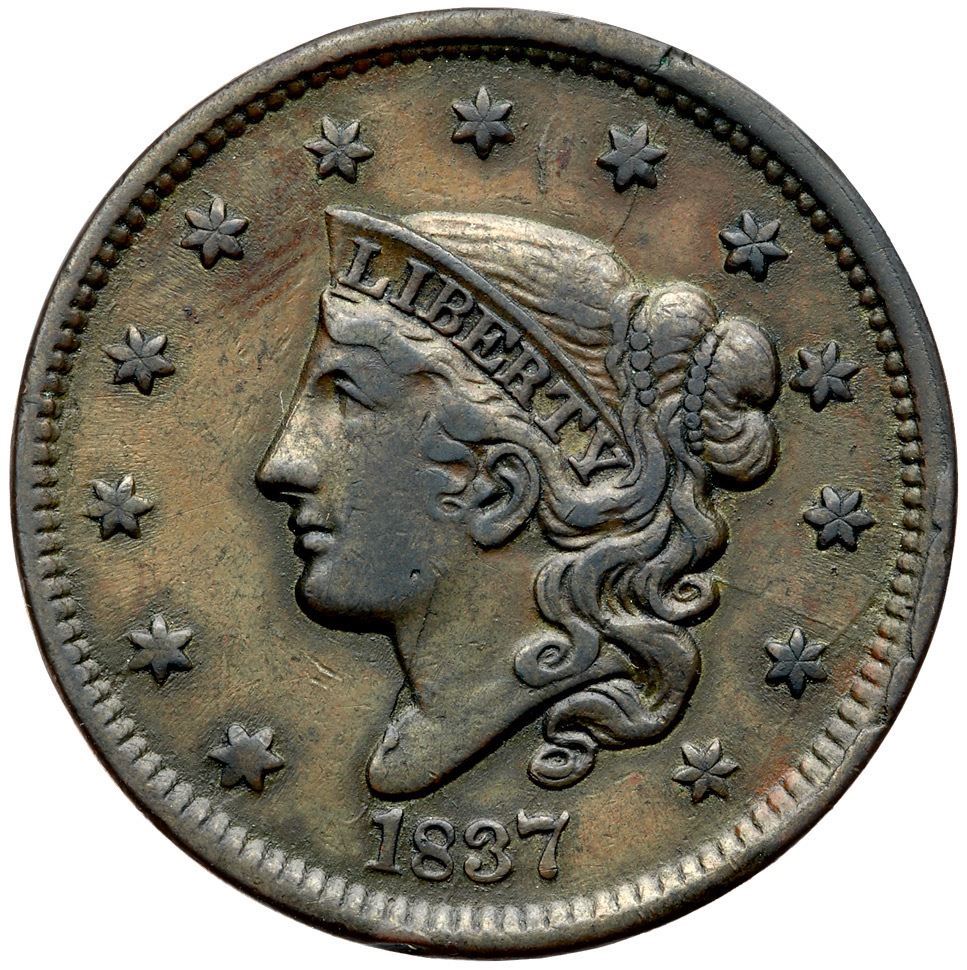 Includes 1831 N-12/.5 R7 (as a die state) M-LDS with a 1-point retained cud break at star 13 G4, 1837 N-2 R7 (as a die state) TDS with two internal cud breaks including one down from star 3 (later than any in the Dan Holmes Collection) G6, 1837 N-9 R1 Beaded Hair Cord LDS with clearly defined rim cuds from star 11 to star 13 VF25 net VF20 for recoloring, and 1839 N-4 R1 Silly Head LDS (what some call N-17) VF30 net VF25+ for nicks. Lot of 4 coins.
