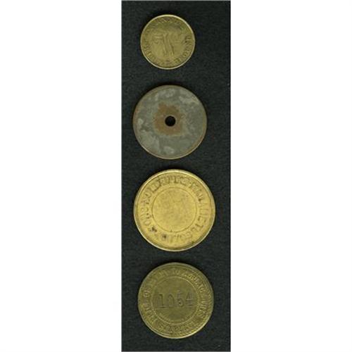 <B>Quartet of Vintage British Theater Tokens.</B></I> Includes a circa-1860s token issued by <B>Madame Tussaud & Sons, London; </B></I>a theater token from <B>Covent Garden </B></I>dated 1809; plus a couple of other pieces.<BR><BR><b>Shipping:</b> Coins & Currency (<a target="_blank" href="http://www.heritageauctions.com/common/shipping.php">view shipping information</a>)