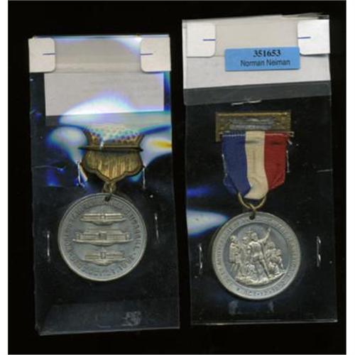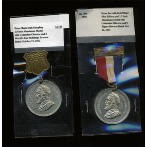 <B>Quartet of World's Fair Medals With Badges/Ribbons.</B></I> Brass/white metal. Includes<B> three medals from the 1892 Columbian World's Fair </B></I>with either a badge or a ribbon with a badge; and a <B>1904 St Louis World's Fair medal</B></I> with so-called dollar, HK-300, holed and attached to a ring with bar.<BR><BR><b>Shipping:</b> Coins & Currency (<a target="_blank" href="http://www.heritageauctions.com/common/shipping.php">view shipping information</a>)