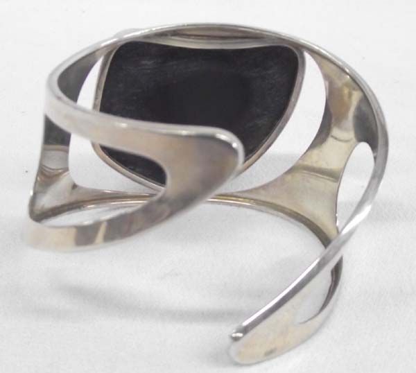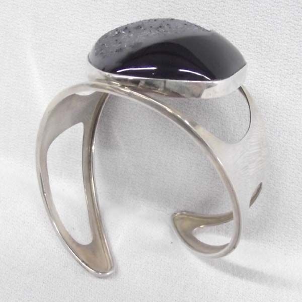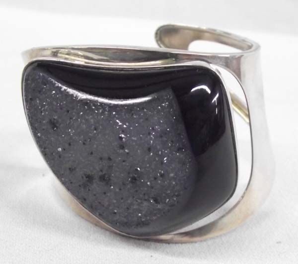 Quartz Druzy Bracelet. Large black and black/blue druzy stone in a modern design cuff bracelet setting. The stone is 1.5''x2'' and the bracelet is 7.25'' inside including opening and 2-7/8''W.