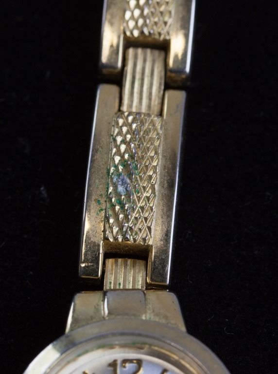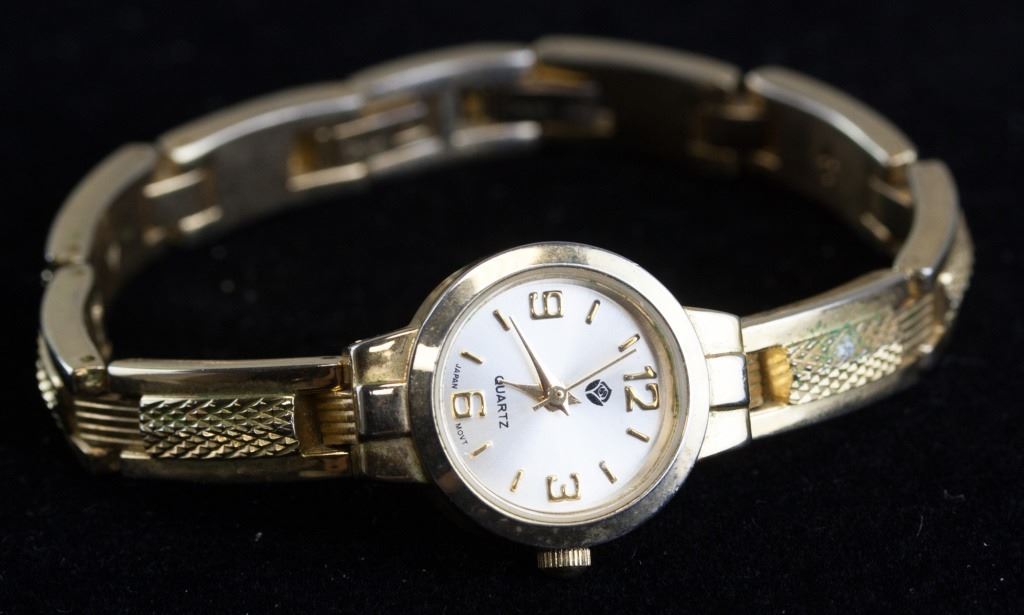 Ladies watch. In gold tone. With round watch face. "QUARTZ" and "JAPAN MOVT" printed near 6 o'clock position. "STAINLESS STEEL CASEBACK / V-503 / JAPAN MOVT / 337 ROSL0123" inscribed on back. Diameter: 6.5 cm, 36 grams.