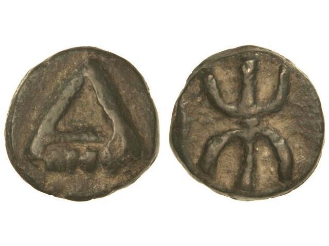 Quatrunx. 225-213 a.C. ANÓNIMO. ASCULUM. APULIA. Anv.: A y debajo cuatro puntos. Rev.: Rayo. 48,50 grs. Pátina oscura. T&V-174. EBC.