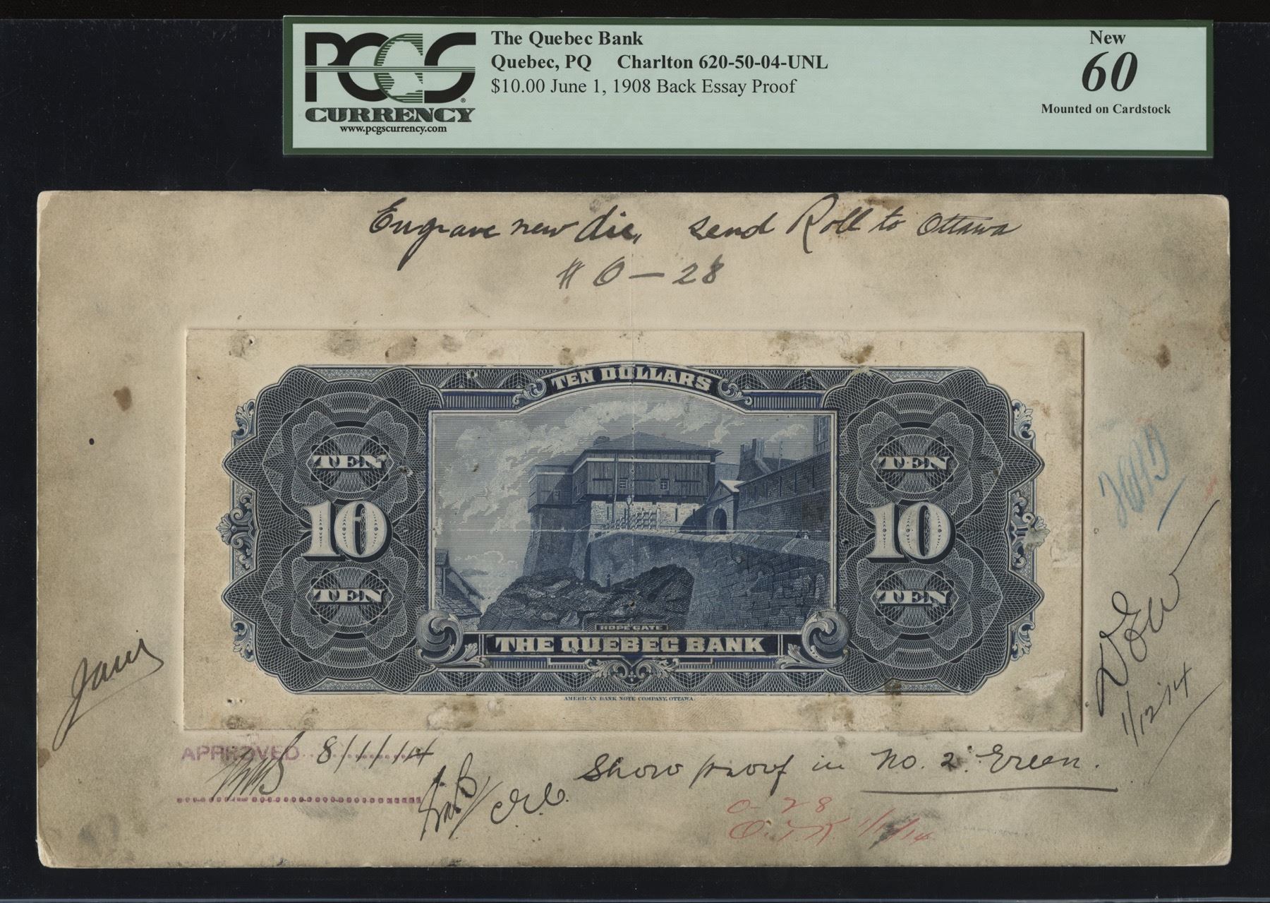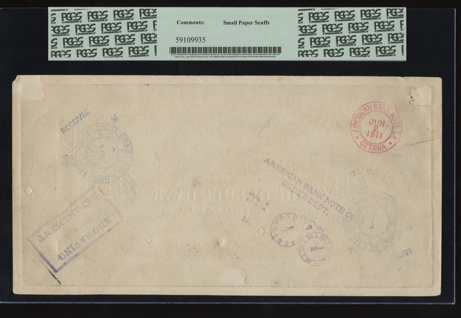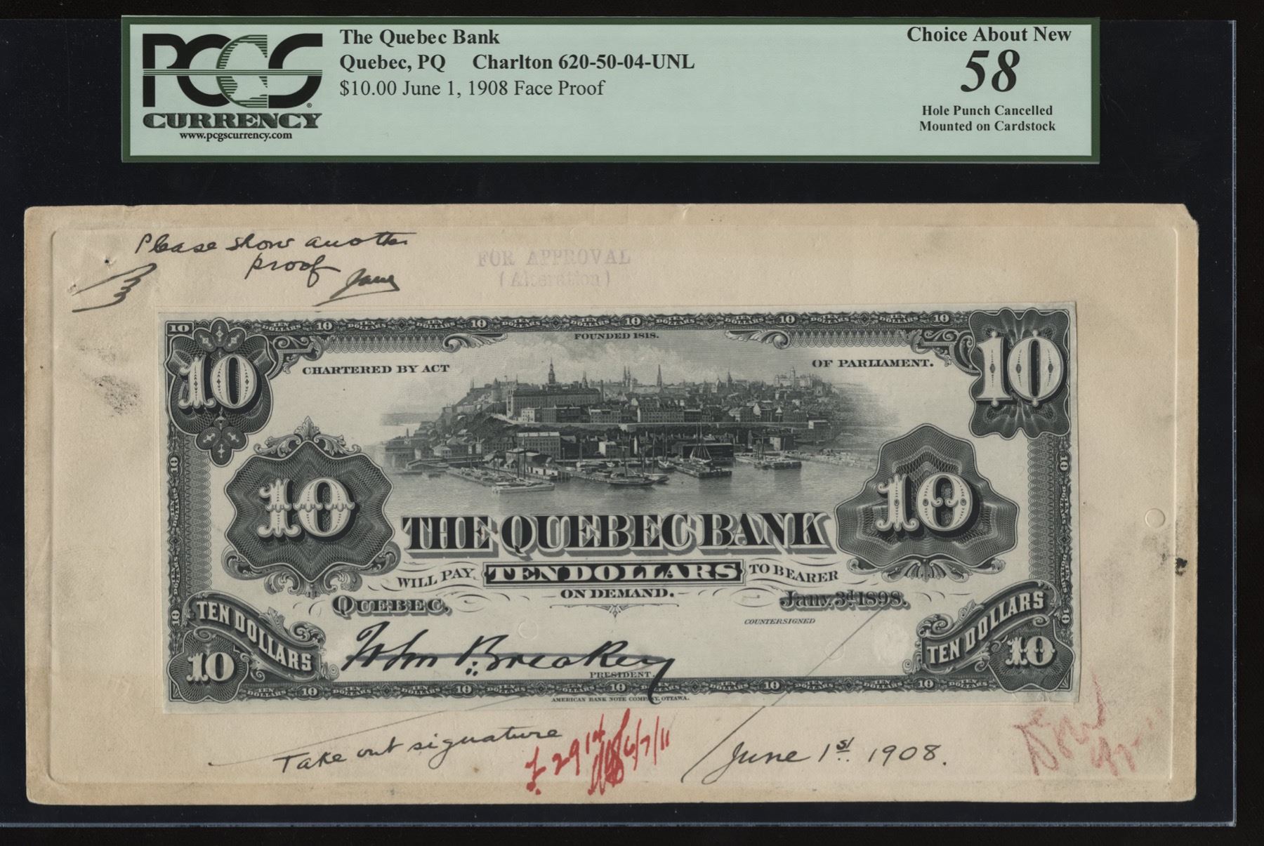 No tint; like 620-44-04P but has "Founded 1818" added at the top, not seen on the issued 1898 $10. Back is date stamped 1911, consistent with the time that the Founded 1818 text was being added to the 1908 issue. Mounted on card; two incomplete punch cancels. Instructions written on the item include the removal of the John Breakey engraved signature and altering the date from Jany 3d 1898 to June 1st 1908. PCGS AU58.