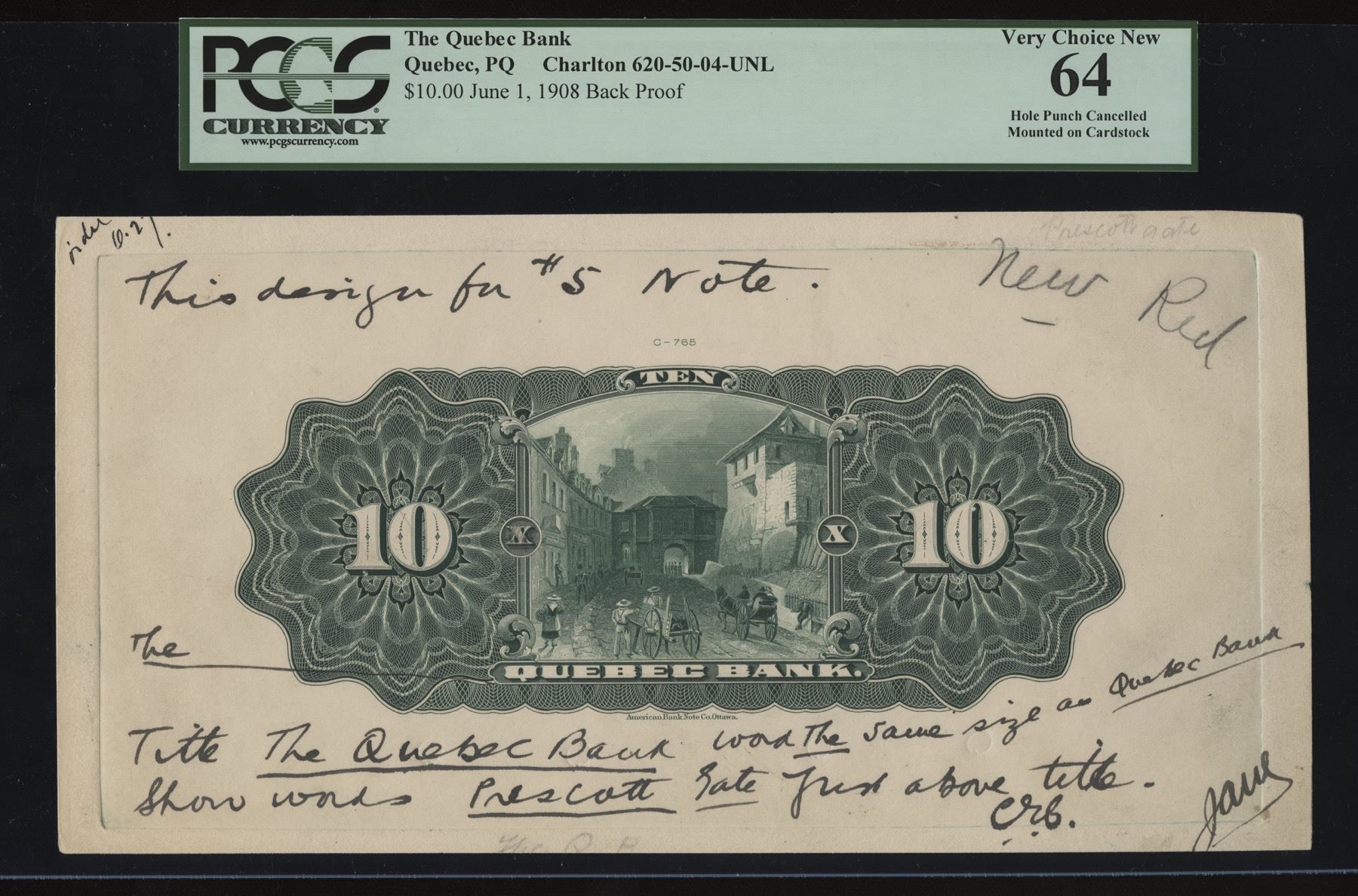 An interesting lot relating to the final issue, still dated 1908 but prepared circa 1914. $10 Back Proof, showing the Prescott Gate, previously used on the 1898 $20 from which it has been developed. The issued $10 had the Hope Gate on the back, not the Prescott. This is an essay proof mounted on card, with instructions to redo the design for the $5 back. The bank name below the vignette is to have "The" added, and the words "Prescott Gate" are to be added just above the bank name. An intriguing pencil notation states, "New Red" which we believe pertains to the second item: $5 Back Model, in red. The various authorized changes have been pasted on. Model has two punch hole cancels. PCGS grades these items UNC 64 and UNC 61 respectively.