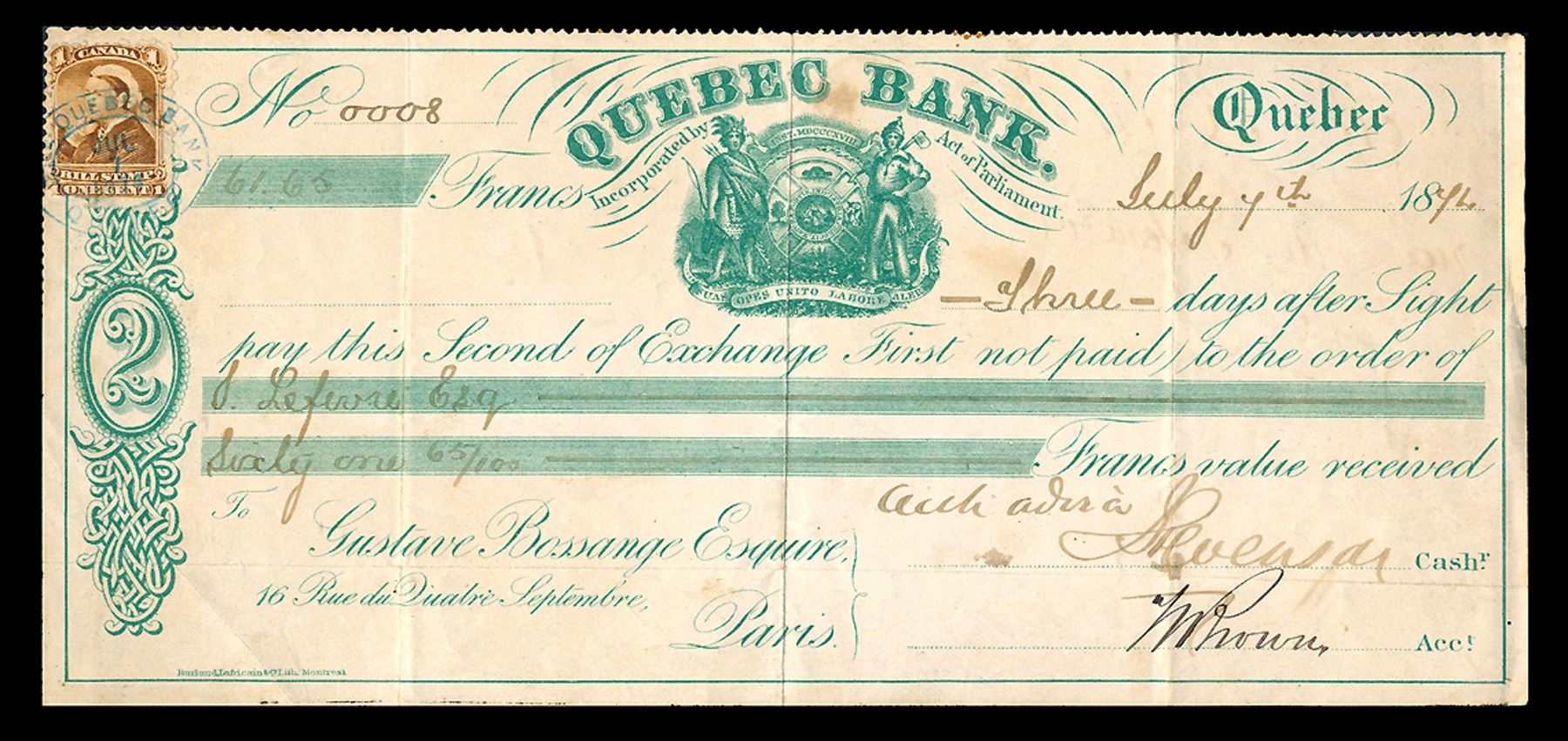 Quebec Bank 1871. Second of exchange, denominated in francs, Paris office