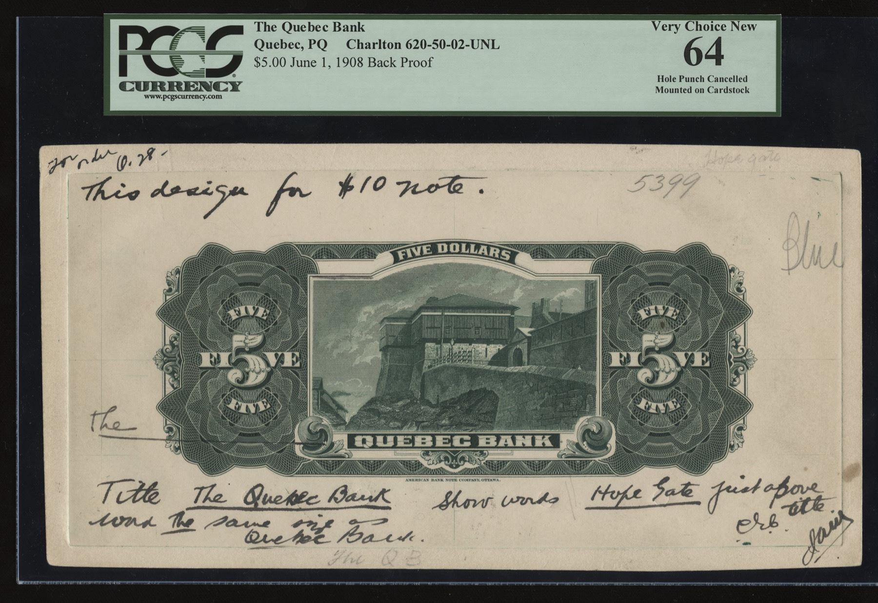 Mounted on card. Shows the Hope Gate, introduced on the 1898 $100 back, and finally assigned to the $10 back for the last version of the 1908 issue. In order to prepare the back for this final use, denominational counters needed to be changed, the bank title had to be modified to include the word "The", and "Hope Gate" was to be engraved above the bank name. No $5 was ever issued by the bank with this back. The frame around the vignette was not completely engraved at the time this proof was printed. There are four blind punch cancels. PCGS gives this piece an UNC 64 grade.