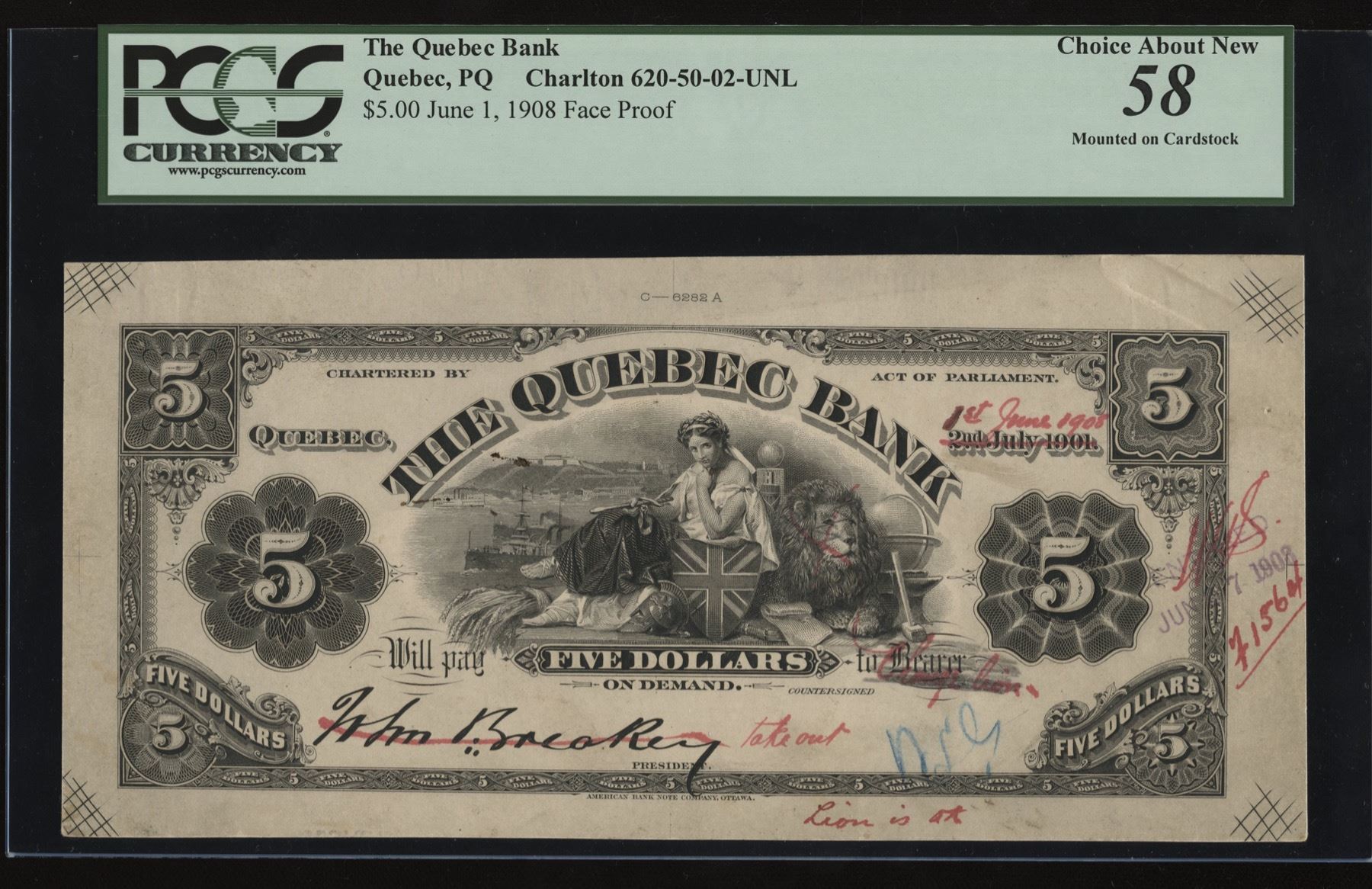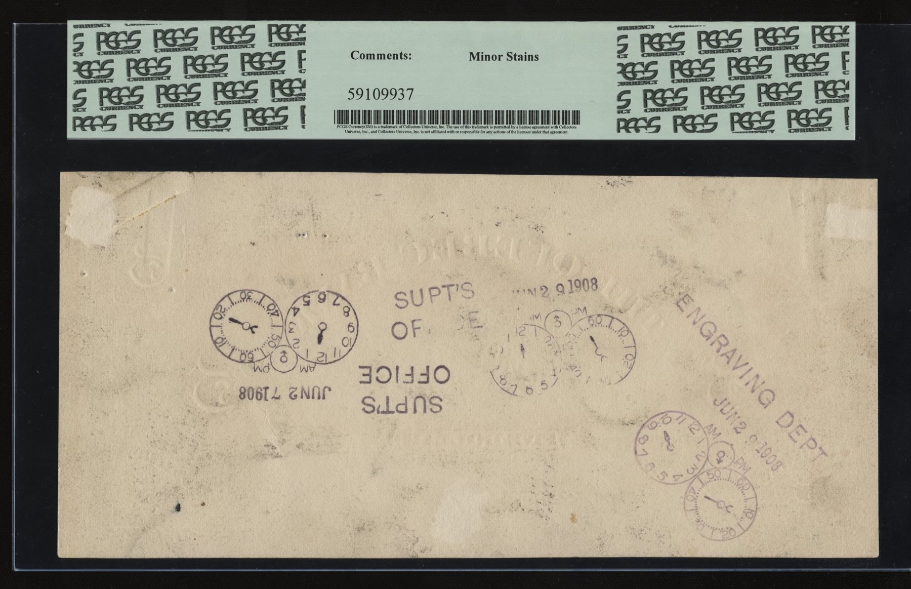 No tint; would be CH 620-46-02P if listed. Back is date stamped 1908, when the first of the three versions of the 1908 issue was being prepared. Printed on card. Written alteration requests include removal of the John Breakey engraved signature and changing the date from 2nd July 1901 to 1st June 1908. Instructions to alter the lion were reconsidered and crossed out - but see previous lot. PCGS AU58.