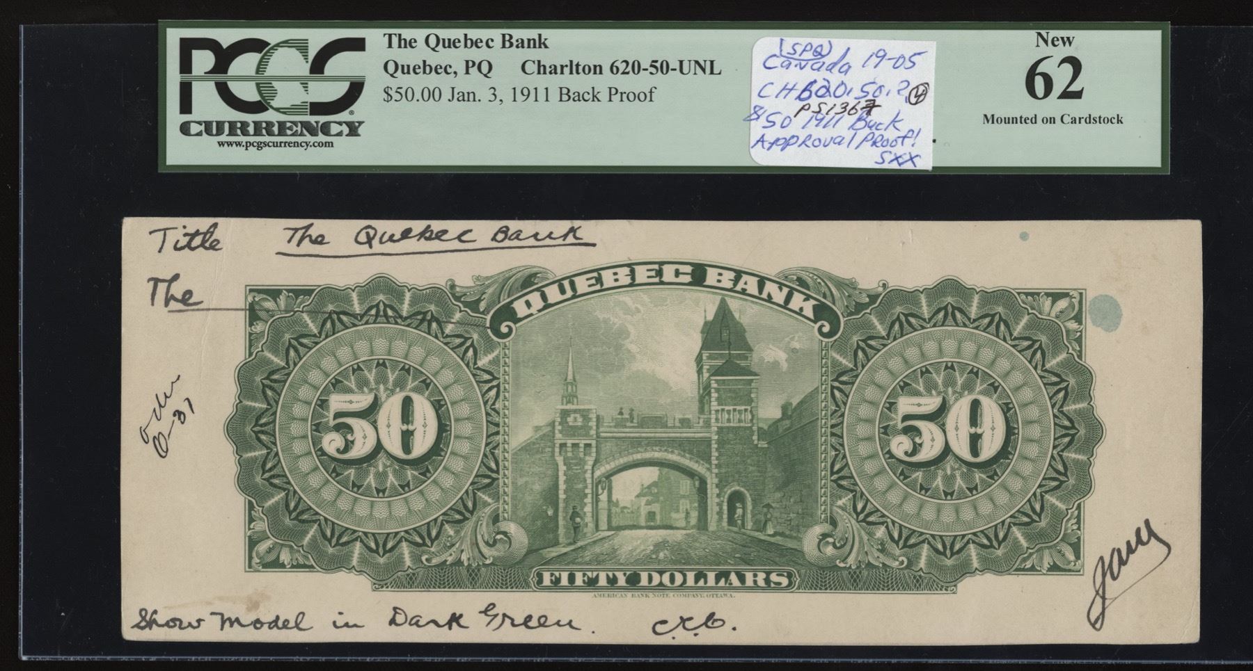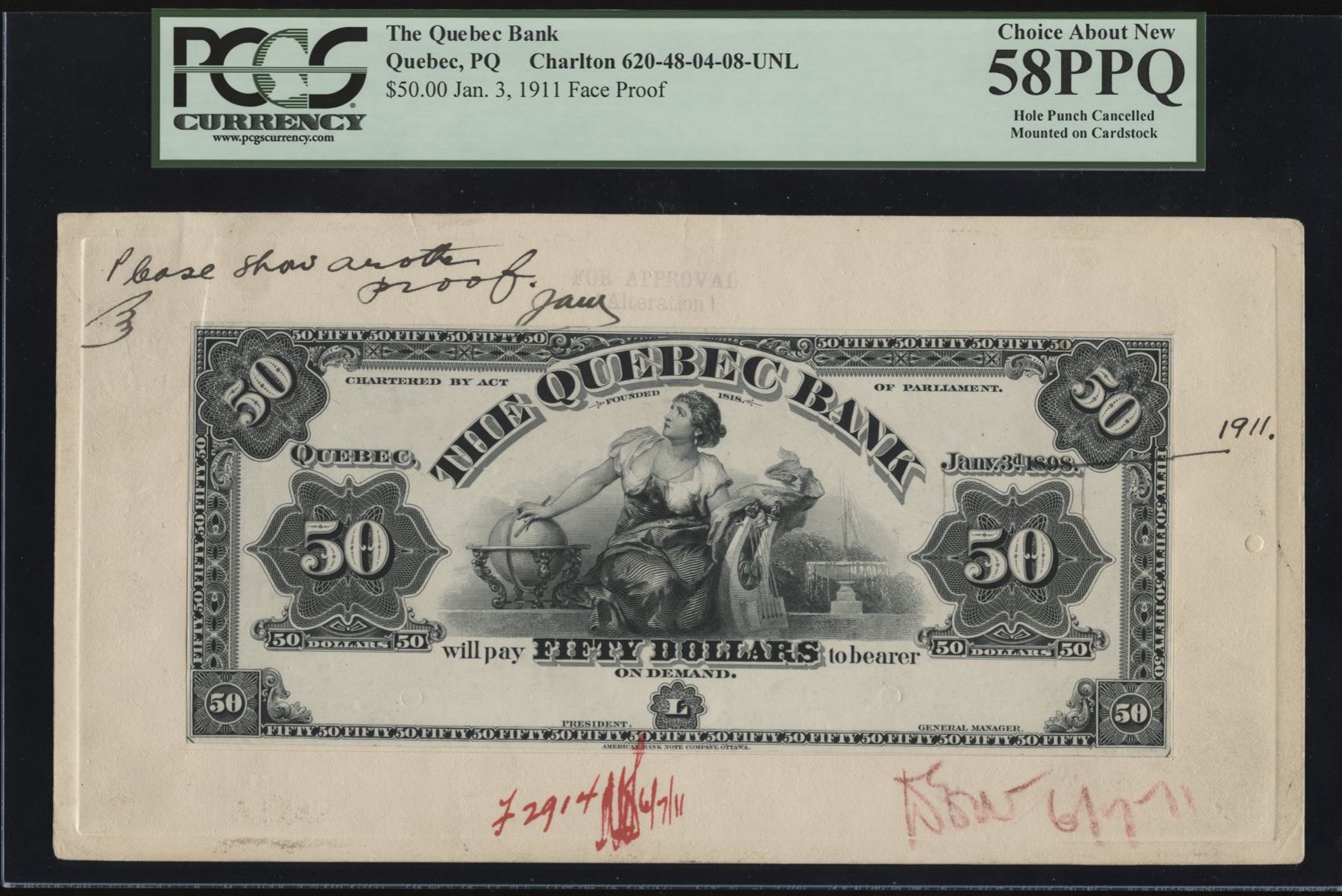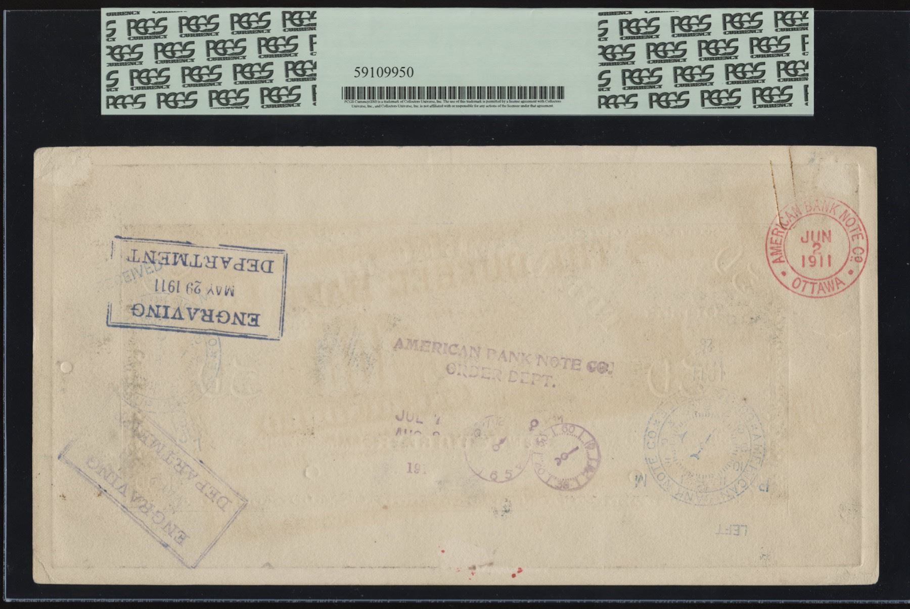 CH 620-44-12P. Face is an approval proof mounted on card, with the year change from 1898 to 1911 indicated in pen. The rest of the date remained Jany. 3d. as on the other high denominations of 1911. Proof has two blind hole punch cancels, and initialed signatures intrude slightly. PCGS assigns an AU58 PPQ grade. Back shows Kent Gate. Without "The" in bank title; notation indicates it is to be added in order to create the later $50 back. Approval proof, mounted on card, with request for an example in darker green. No issued notes are available to the collecting public. PCGS UNC62.
