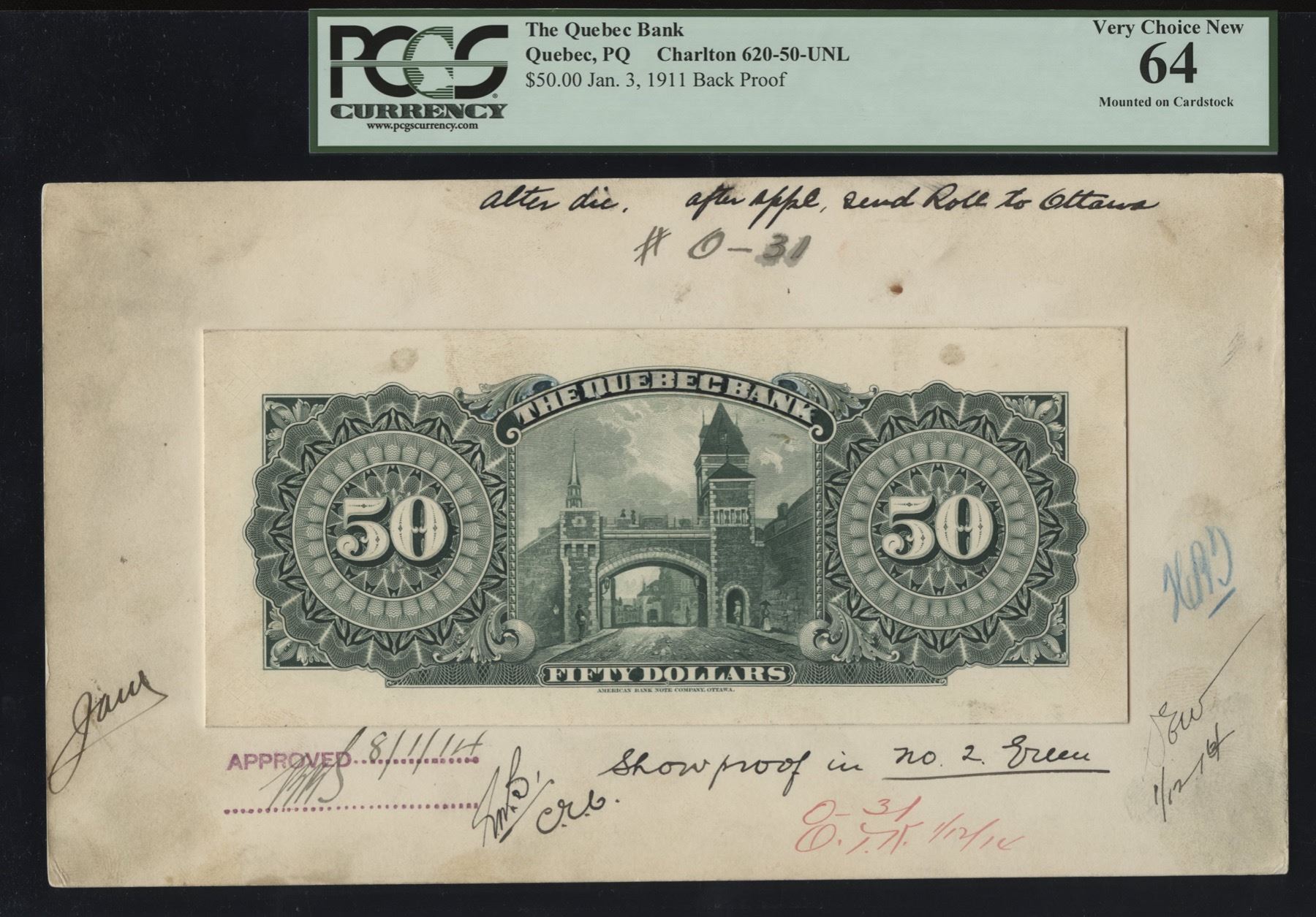 Showing Kent Gate. Darker green than the issued note, which was olive. The model is mounted on card. The bank name is pasted on, revised to include "The", with the scrollwork at the ends above the name altered from 1898. No issued notes are available to the collecting public. PCGS UNC64.