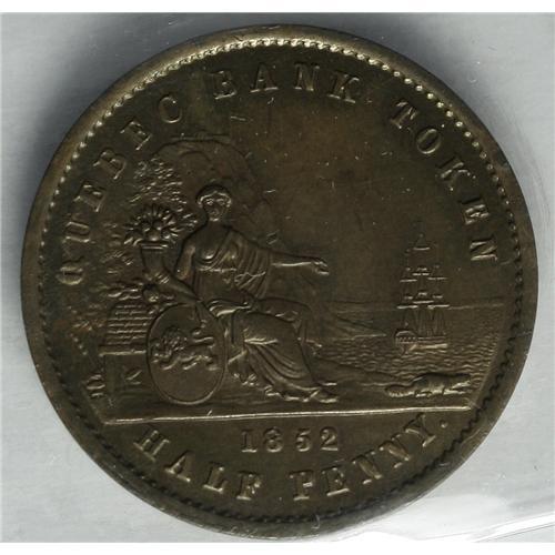 <B>Quebec Bank Token Halfpenny 1852,</B></I> Br-529, CH-PC3, MS60 ICCS. Iridescent surfaces with a nicer appearance than one might expect of the grade.