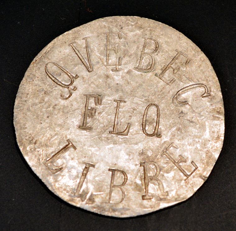 Unusual silver token, "Quebec Libre", "FLQ" punched at centre. Struck on an irregularly shaped coin flan, undertype planed, with reeded edges. Unsure if this political item is contemporary to the FLQ crisis of 1970. VF.