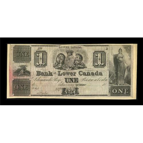 <B>Quebec, LC- Bank of Lower Canada</B></I> $1 Ch. # 410-10-04R<BR> Little is known about this bank, although "signed and issued" notes have been seen bearing dates between 1839 and 1851. This remainder example is mounted on light card stock. <B>Very Fine.</B></I><BR><I>From The Thomas M. Flynn Collection</B></I><BR><BR><b>Shipping:</b> Coins & Currency (<a target="_blank" href="http://www.heritageauctions.com/common/shipping.php">view shipping information</a>)
