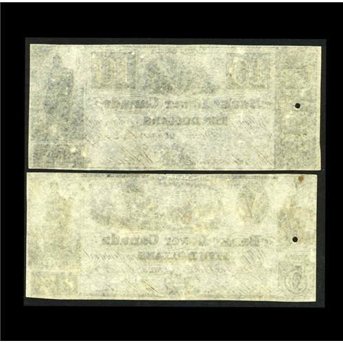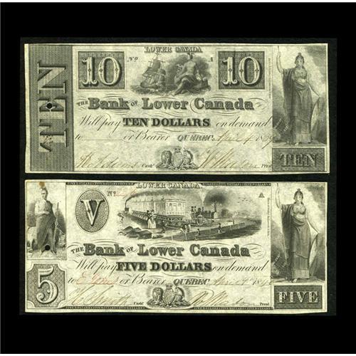 <B>Quebec, LC- Bank of Lower Canada</B></I> $5, $10 Apr. 4, 1840, Apr. 4, 1839 Ch. 410-10-10, 410-10-12 <B>XF,</B></I> PC, <B>AU,</B></I> PC.<BR>Here are two different issued denominations on this short-lived bank. The $5 has a small edge tear and several pinholes.
