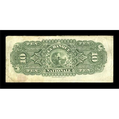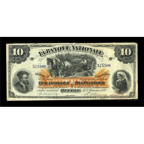 <B>Quebec, PQ- La Banque Nationale</B></I> $10 Jan. 2, 1897 Ch. # 510-20-08<BR> A nice grade specimen with a vivid orange overprint, which, unlike many seen on these notes, has not oxidized to brown or yellow. <B>Fine-Very Fine.</B></I><BR><I>From The Thomas M. Flynn Collection</B></I><BR><BR><b>Shipping:</b> Coins & Currency (<a target="_blank" href="http://www.heritageauctions.com/common/shipping.php">view shipping information</a>)