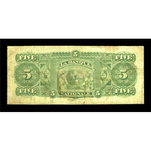 <B>Quebec, PQ- La Banque Nationale</B></I> $5 Jan. 2, 1897 Ch. 510-20-02<BR> A scarce chartered bank which is seldom offered. <B>Fine.</B></I><BR><I>From The John Ameen Collection</B></I><BR><BR><b>Shipping:</b> Coins & Currency (<a target="_blank" href="http://www.heritageauctions.com/common/shipping.php">view shipping information</a>)