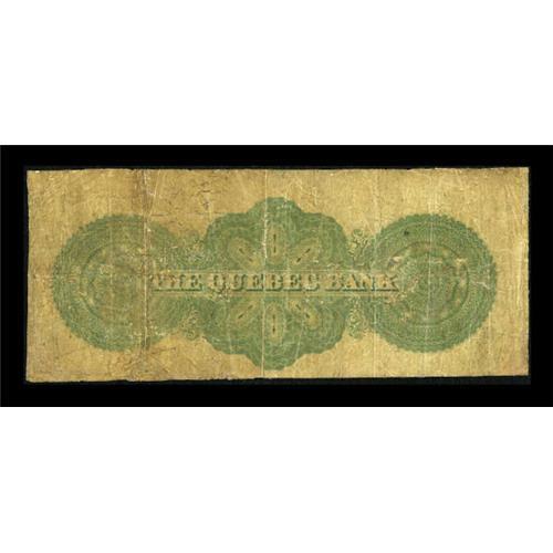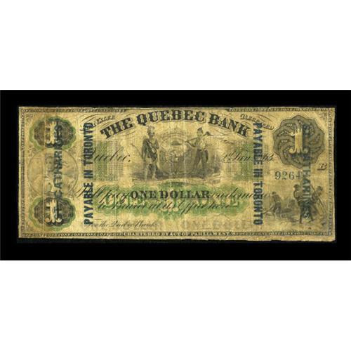 <B>Quebec, PQ- The Quebec Bank</B></I> $1 Jan. 2, 1863 Ch. # 620-34-02a<BR> A very scarce note from one of the earliest banks in Canada, founded in 1818. After successfully operating for a century, it merged with The Royal Bank of Canada in 1917. This 1863 example bears the twin blue overprints "St. Catherines/Payable in Toronto." Well circulated but intact <B>Very Good.</B></I><BR><I>From The Thomas M. Flynn Collection</B></I><BR><BR><b>Shipping:</b> Coins & Currency (<a target="_blank" href="http://www.heritageauctions.com/common/shipping.php">view shipping information</a>)