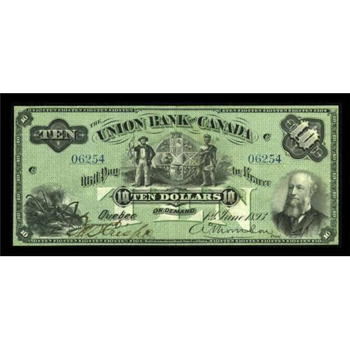 <B>Quebec City, PQ- The Union Bank of Canada</B></I> $10 June 1, 1893 Ch. # 730-12-04<BR> This bank was organized under a provincial charter in 1865 as The Union Bank of Lower Canada, changing its name to The Union Bank of Canada in 1886. In 1911 it acquired the United Empire Bank of Toronto, and the following year it moved its head office to Winnipeg, where it issued from 1912 until its acquisition by the Royal Bank of Canada in 1925. Bright <B>Extremely Fine-About Uncirculated,</B></I> a very scarce note. <BR><I>From The Thomas M. Flynn Collection</B></I><BR><BR><b>Shipping:</b> Coins & Currency (<a target="_blank" href="http://www.heritageauctions.com/common/shipping.php">view shipping information</a>)