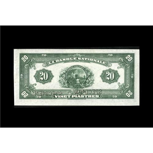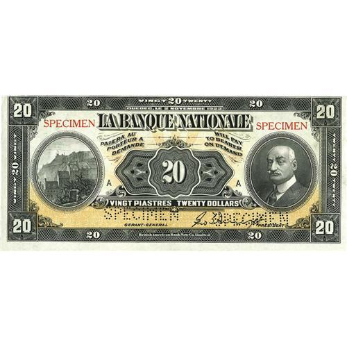 <B>Quebec, QC- La Banque Nationale</B></I> $20 Nov. 2, 1922 Ch. 510-22-06S Specimen<BR>Original surfaces on this $20 that has a tight top margin. "SPECIMEN" is also roulette cancelled into the paper. <B>Choice Crisp Uncirculated.</B></I>
