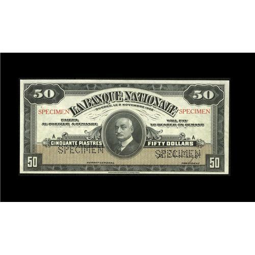 <B>Quebec, QC- La Banque Nationale</B></I> $50 Nov. 2, 1922 Ch. 510-22-08S Specimen<BR>A couple of pinholes are found on this note that is punch cancelled "SPECIMEN." <B>Choice Crisp Uncirculated.</B></I>