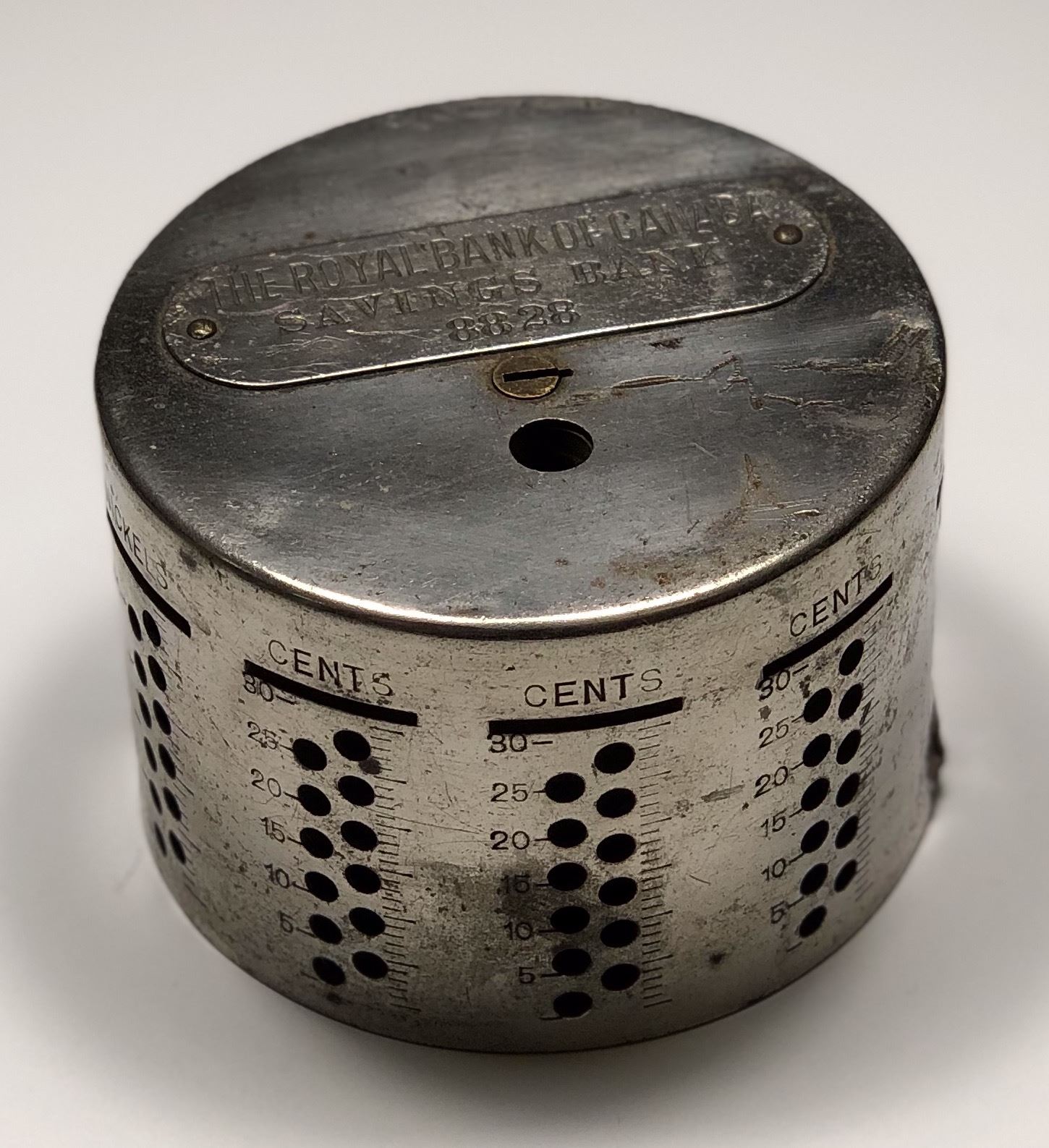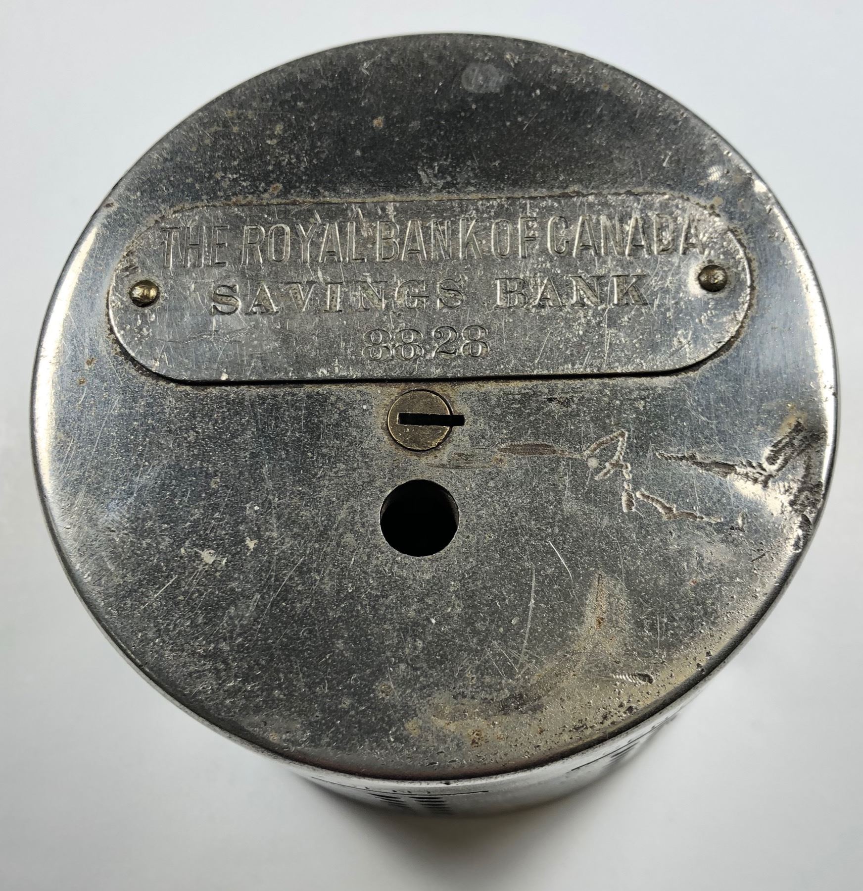 The Royal Bank of Canada, an unusual round chrome bank with slots for the various decimal coins. It is numbered 8828 and called a Savings Bank. A really neat piece of banking history.