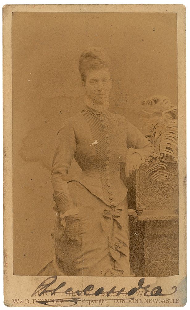 Queen Consort to Edward VII of England (1844–1925) and mother of George V. Original 2.5 x 4.25 carte-de-visite portrait by W. & D. Downey of London, signed in the lower border in black ink, “Alexandra.” In very good condition, with scattered damp staining and the image slightly faded.
