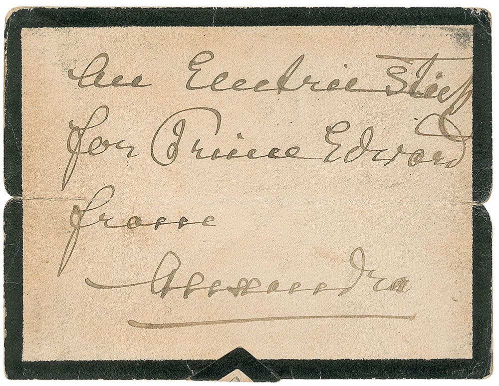 Queen Consort to Edward VII of England (1844–1925) and mother of George V. Black-bordered 5 x 3.75 envelope addressed in Alexandra’s hand to “Prince Edward,” signed at the bottom in black ink, “Alexandra.” In very good condition, with a central horizontal fold (separated at the edges), and light overall soiling.