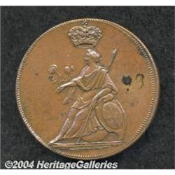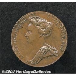 <B>Queen Anne Pattern Halfpenny ND, </B></I>Peck types 718-728, large bust of Anne/Britannia seated with large crown above. Glossy brown AU-UNC with small collector's ink in right reverse field. Very scarce. <BR><BR><B>Important notice:</B> Heritage usually auctions material at the rate of 200-250 lots per hour. On some occasions eBay Live bid software or the Internet may not be able to keep up with the pace of the auction. We recommend placing a realistic absentee bid now as insurance to avoid disappointment. Occasionally the auctioneer may eliminate or reject an eBay Live bid, and the auctioneer may also reopen a lot after the close of the eBay live bidding (usually because we missed an audience bid), and may reject your bid even if it shows you as the winning bidder. By bidding via eBay Live, you agree that Heritage may award the lot to another bidder at its sole discretion under the circumstances described above or any other reasonable circumstances. Since eBay bids are not shown to us until we open the lot on the floor, we treat those bids just like floor bids. In most cases the floor responds before the eBay bid is presented to us, due to Internet lag time, so for consistency we have made it a policy that floor bids are always considered first over tie eBay live bids. Also please note that all Heritage lots purchased through eBay Live carry a 20% Buyer's Premium. Please make sure you read the Terms and Conditions before you bid.