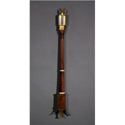 Of typical form, having three finials, the outer two adjusting blue steeled pointers on a silvered register scale, calibrated 28-31 and dated 1680; the gilt brass hood chased with foliate scrolls and inscribed Daniel/ Quare, the fluted mahogany shaft ending in a barley-twist divided by ivory collets and supported by a walnut plinth ending on four gilt brass folding feet.
