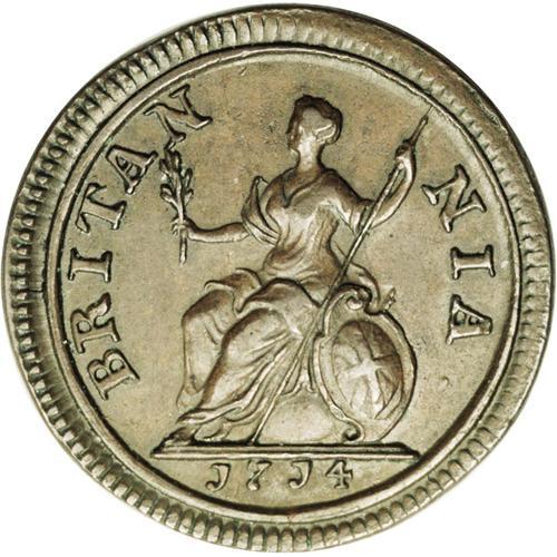 <B>Queen Anne currency farthing, 1714. </B></I>S-3625. Large flan. Choice About XF, though many would not hesitate to label this lovely coin Extremely Fine, even in "conservative" England. A little wear on Britannia's highest points, but the portrait is stunning and the color of the flan is a beautiful, even chocolate brown. Small "test scratch" (?) in the field above the portrait, probably a contemporary test to see if this was really real, for that's how things were done in the old days.