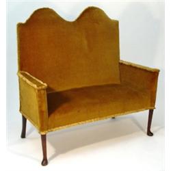 Queen Anne design camelback two seater settee with mahogany framed legs with pad feet