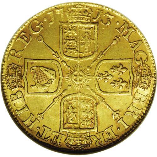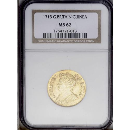 Queen Anne guinea, 1713.S-3574. MS62 NGC. Soft golden s Queen Anne guinea, 1713.