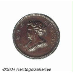 Queen Anne pattern Farthing 1713, chariot reverse, Peck-764. PAX MISSA. Struck in copper on a thick, large flan. Rare. MS63 PCGS. Quite a bit of double striking shows, in concert with the comments about these made by Peck, suggesting they might have been struck during the reign of George II. This piece has glossy mahogany-brown surfaces and is very attractive. Seldom seen but not extremely rare.From the Craig Haller Collection. Important notice: Heritage usually auctions material at the rate of 200-250 lots per hour. On some occasions eBay Live bid software or the Internet may not be able to keep up with the pace of the auction. We recommend placing a realistic absentee bid now as insurance to avoid disappointment. Occasionally the auctioneer may eliminate or reject an eBay Live bid, and the auctioneer may also reopen a lot after the close of the eBay live bidding (usually because we missed an audience bid), and may reject your bid even if it shows you as the winning bidder. By bidding via eBay Live, you agree that Heritage may award the lot to another bidder at its sole discretion under the circumstances described above or any other reasonable circumstances. Also please note that all Heritage lots purchased through eBay Live carry a 20% Buyer's Premium. Please make sure you read the Terms and Conditions before you bid.