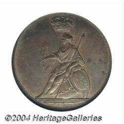 Queen Anne pattern Halfpenny ND, Britannia reverse, Peck-728 (listed as Rare). MS64 PCGS. Fairly graded, a very choice coin showing slight red luster but mostly a lovely medium brown in color. Bold strike. Edge cannot be seen in the slab but generally these were made as Proofs.From the Craig Haller Collection. Important notice: Heritage usually auctions material at the rate of 200-250 lots per hour. On some occasions eBay Live bid software or the Internet may not be able to keep up with the pace of the auction. We recommend placing a realistic absentee bid now as insurance to avoid disappointment. Occasionally the auctioneer may eliminate or reject an eBay Live bid, and the auctioneer may also reopen a lot after the close of the eBay live bidding (usually because we missed an audience bid), and may reject your bid even if it shows you as the winning bidder. By bidding via eBay Live, you agree that Heritage may award the lot to another bidder at its sole discretion under the circumstances described above or any other reasonable circumstances. Also please note that all Heritage lots purchased through eBay Live carry a 20% Buyer's Premium. Please make sure you read the Terms and Conditions before you bid.