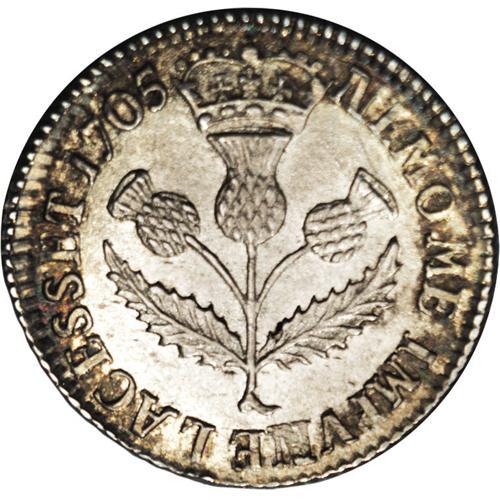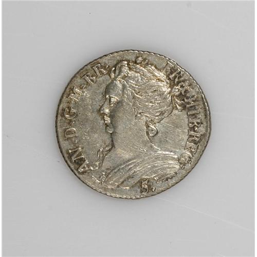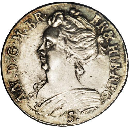 <B>Queen Anne silver 5 Shillings 1705, </B></I>S-5704, KM-148, Choice XF, an exceptional piece with a deep strike, and light gold and silvery gray toning, high rim on reverse. Very little wear, and residual luster. Very few show up this nice! Our estimate of value could be conservative.<BR><I>From the Blue Ridge Collection</B></I><BR><BR><b>Shipping:</b> Coin/Currency (<a target="_blank" href="http://www.heritageauctions.com/common/shipping.php">view shipping information</a>)