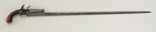 Queen Anne style Flintlock sword/pistol with silver mounts and Latin inscriptions on blade. The piece measures 37-1/4” overall the blade measures 32”, the pistol portion 10” overall with 3-3/4” cannon type barrel of approx 60 cal smooth bore. The blade is attached to the barrel by a forged lug and a screw thru blade into breech. The pistol shows no name or proofs. The blade is inscribed in fancy scrolls and on left reads“Pro Chfisfo A Pollenis” and “Tohmmi Bemfgi“. On reverse is also a fancy long inscription that is more difficult to make out. The left side of the pistol stock near the breech shows a brake and old repair with woodnailed back otherwise grip is good with carving around tang in shell design. The silver mounts show a mask butt and a fancy plaque at wrist. The metal is in good condition with some light pitting and erosion and in need of light cleaning. Consignor notes mention Ireland. From an old New York collector’s estate. Est.; $1,500-$3,000.