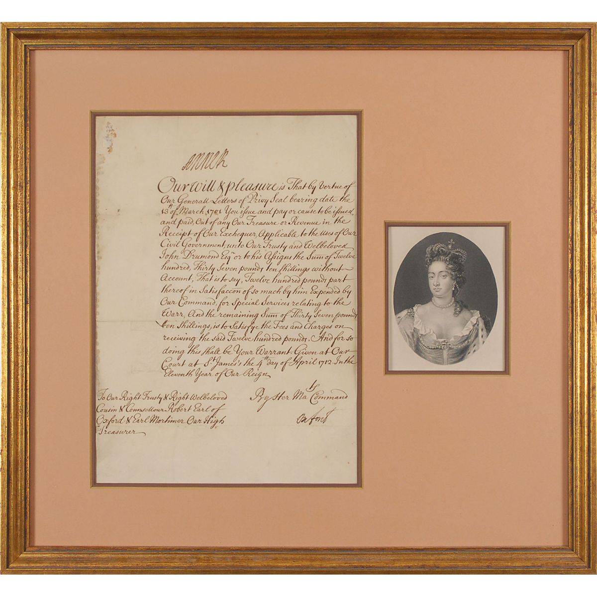 Queen of England (born 1665), the last British monarch in the Stuart dynasty, who reigned from 1702 until her death in 1714. Manuscript DS, signed “Anne R,” one page, 8.5 x 12, April 4, 1712. Queen Anne directs the treasurer to “issue and pay or cause to be issued and paid…unto Our Trusty and Welbeloved John Drumond Esq…Twelve hundred pounds part thereof in Satisfaction of so much by him Expended by Our Command, for Special Services relating to the Warr, and the remaining Sum of Thirty Seven pounds ten shillings, is to satisfy the Fees and Charges.” Double-matted and framed with a portrait of the queen to an overall size of 19.25 x 18. Intersecting folds, scattered creases, small tear to lower left, and adhesive remnants along the left edge, otherwise fine condition. A desirable, boldly penned royal document.