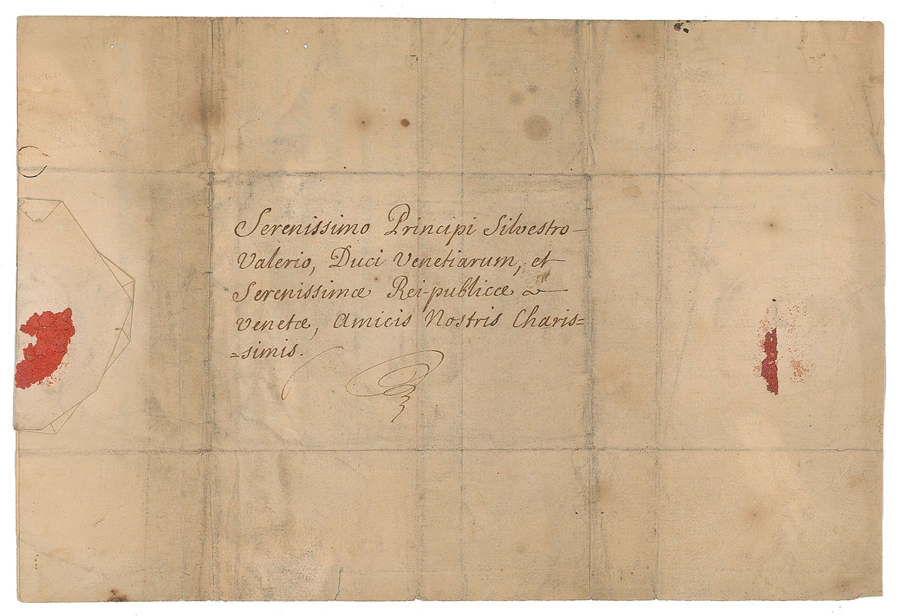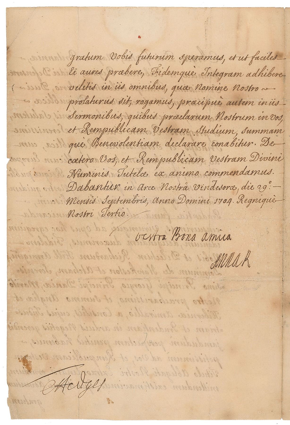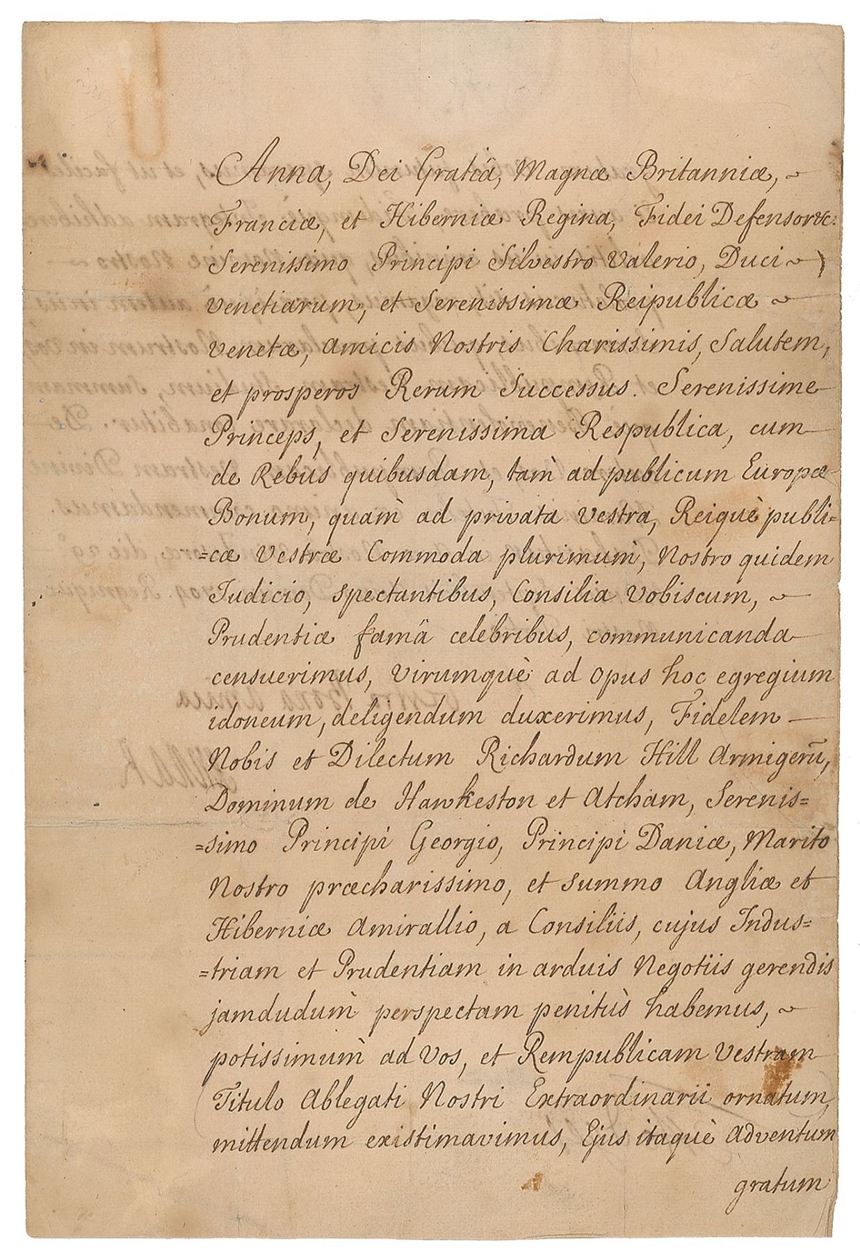 Manuscript DS in Latin, signed “Anna R.,” one page both sides, 7.25 x 11, September 9, 1704. Untranslated official letter to Prince Silvestro Valerio of the Republic of Venice. In very good to fine condition, with scattered light staining, foxing, and toning, and a rusty paperclip impression to the top edge.