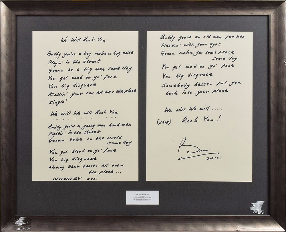 Fantastic handwritten lyrics to "We Will Rock You" by Queen guitarist Brian May, two pages, 8.25 x 11.75, boldly penned in black felt tip and signed at the conclusion, "Brian, 2010." The lyrics, in full: "Buddy you’re a boy make a big noise / Playin' in the street / gonna be a big man someday / You got mud on yo' face / You big disgrace / Kickin' your can all over the place / singin' / We will we will rock you / Buddy you’re a young man hard man / Fightin' in the street / Gonna take on the world someday / You got blood on yo' face / You big disgrace / Waving that banner all over the place… / WWWWRY etc. / Buddy you’re an old man poor man / Pleadin' with your eyes / gonna make you some peace someday / You got mud on yo' face / You big disgrace / Somebody better put you back into your place / We will We will…Rock You!" Matted and framed with an information card indicating that the lyrics were donated by May to PRS for Music's Art of the Song 2010 in aid of Teenage Cancer Trust, to an overall size of 22.25 x 18. In fine condition. 'We Will Rock You' was written by May for Queen's best-selling 1977 album News of the World, and released as the B-side to the 'We Are the Champions' single. Both songs are typically played on the radio together without interruption, and the pair have become fan-favorite staples in sporting arenas across the world. A highly desirable set of handwritten lyrics for one of Queen's most recognizable hits.