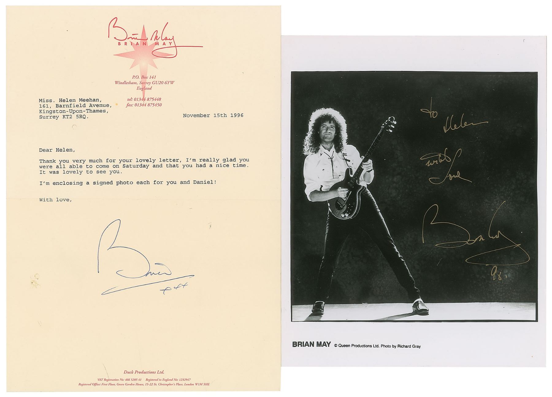 Two items: a TLS, signed "Brian xxx," one page, 8.25 x 11.75, personal letterhead, November 15, 1996, addressed to Helen Meehan, in full: "Thank you very much for your lovely letter, I'm really glad you were all able to come on Saturday and that you had a nice time. It was lovely to see you. I'm enclosing a signed photo each for you and Daniel!"; and a satin-finish 8 x 10 Queen Productions publicity photo of May playing the guitar in a full-length pose, signed and inscribed in gold ink, "To Helen, with love, Brian May, '98." In overall fine condition. Accompanied by a color Polaroid photo of a cat, signed and inscribed by May's wife Anita.