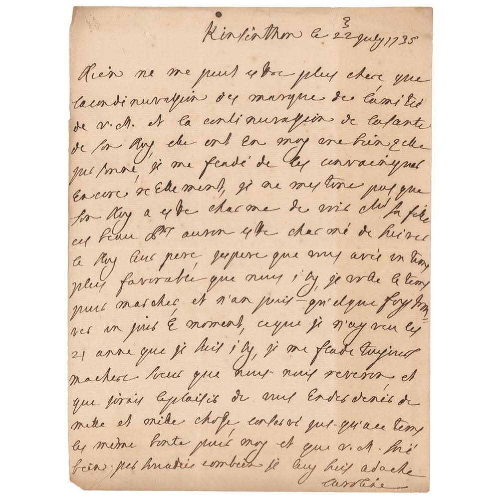 Rare ALS in French, signed “Caroline,†one page, 7.25 x 9.75, July 22, 1735. Untranslated handwritten letter in French by the English queen. In fine condition, with a strip of light toning to the right edge.