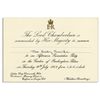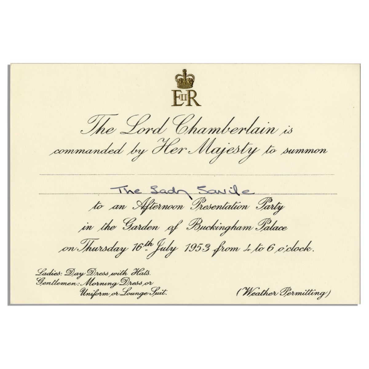 Queen Elizabeth II party invitation. Partially-printed invitation is for an ''Afternoon Presentation Party in the Garden of Buckingham Palace on Thursday 16th July 1953...'' With the Queen's royal cypher at the top in gilt. Measures 7.25'' x 5''. Fine.
