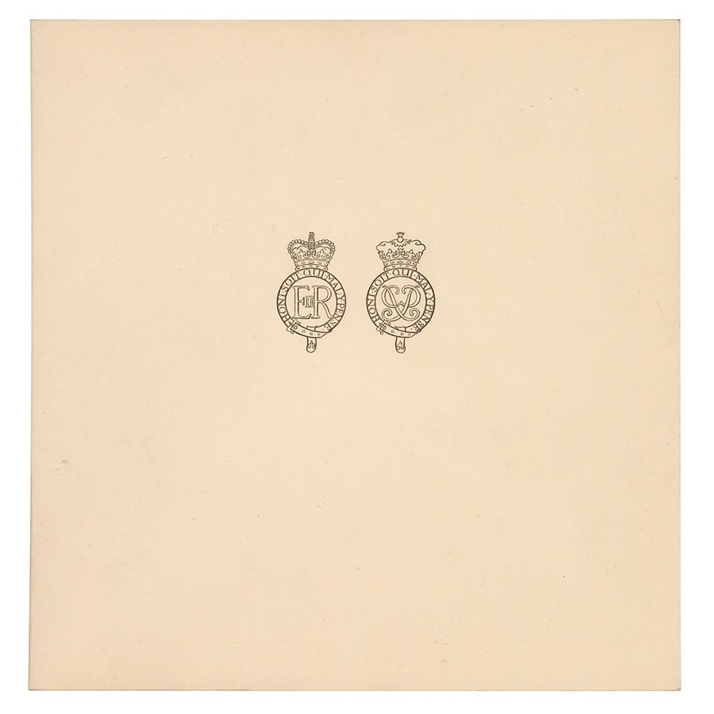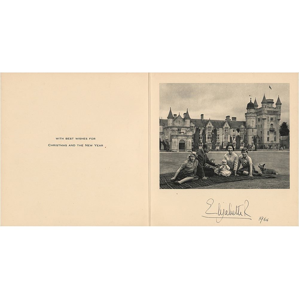 Desirable Royal Christmas card from 1960, with their crests embossed on the front, measuring 16 x 8.25 open, featuring a lovely image of Queen Elizabeth II and Prince Philip posing with their three children on the front lawn of Balmoral Castle, signed below the image in fountain pen, "Elizabeth R, 1960." In very fine condition. Accompanied by the original envelope.