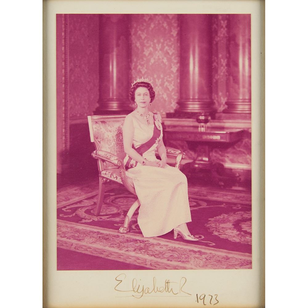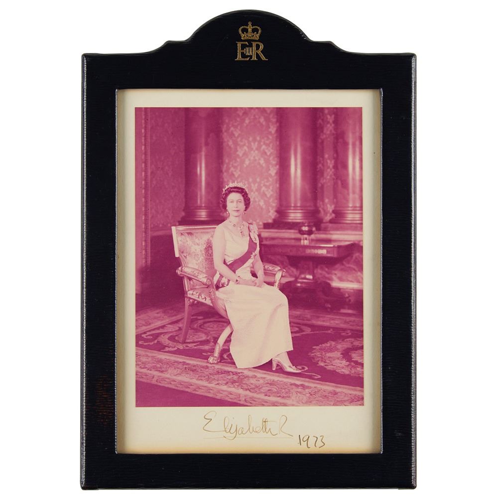 Official color matte-finish 6 x 8 photo of Queen Elizabeth II in a formal seated pose by photographer Anthony Buckley, signed on the original mount in fountain pen, "Elizabeth R., 1973." Reverse is marked "5170–G" and bears Buckley's photography stamp. Displayed in an attractive leather-bound frame by Plante & Johnson of London. In fine condition, with light overall fading.