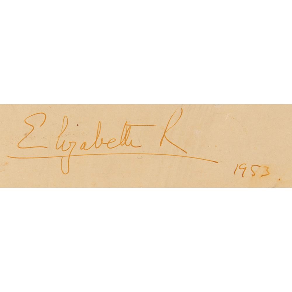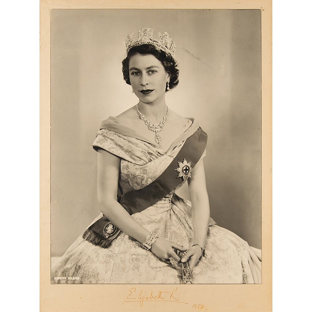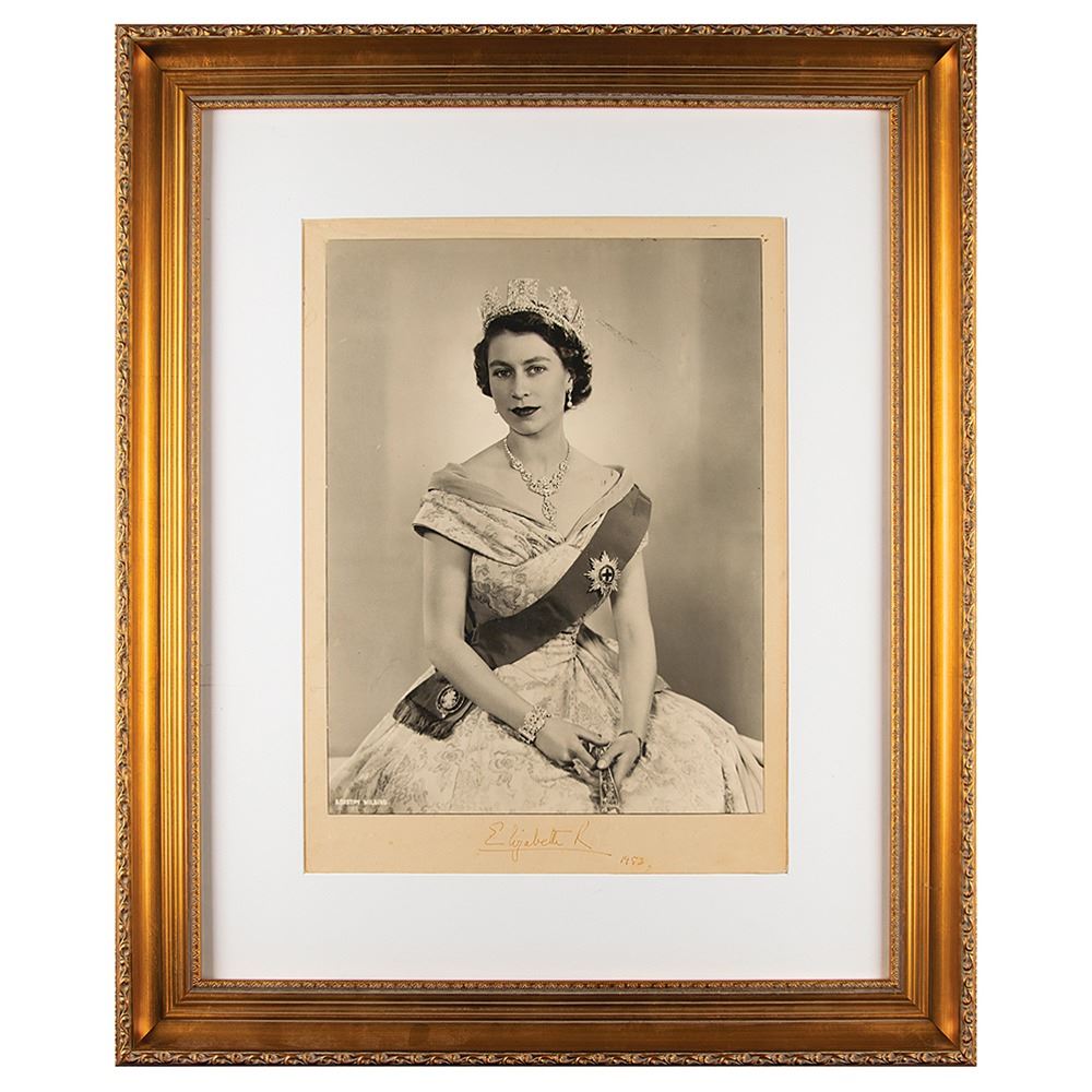 Splendid oversized vintage matte-finish 15 x 19.5 portrait of Queen Elizabeth II wearing her glimmering crown jewels by Royal Court photographer Dorothy Wilding, affixed to its original 16.5 x 22.25 mount, signed on the mount in fountain pen in the year of her coronation, "Elizabeth R, 1953." Beautifully archivally matted and framed to an overall size of 29.5 x 35.5; Dorothy Wilding's studio label, numbered in pencil "015957 J," remains affixed to the reverse of the mount, covered by the frame's backing. In fine condition, with scattered small stains. Accompanied by a full letter of authenticity from JSA. An absolutely stunning, impressively large portrait of the queen in her regalia.