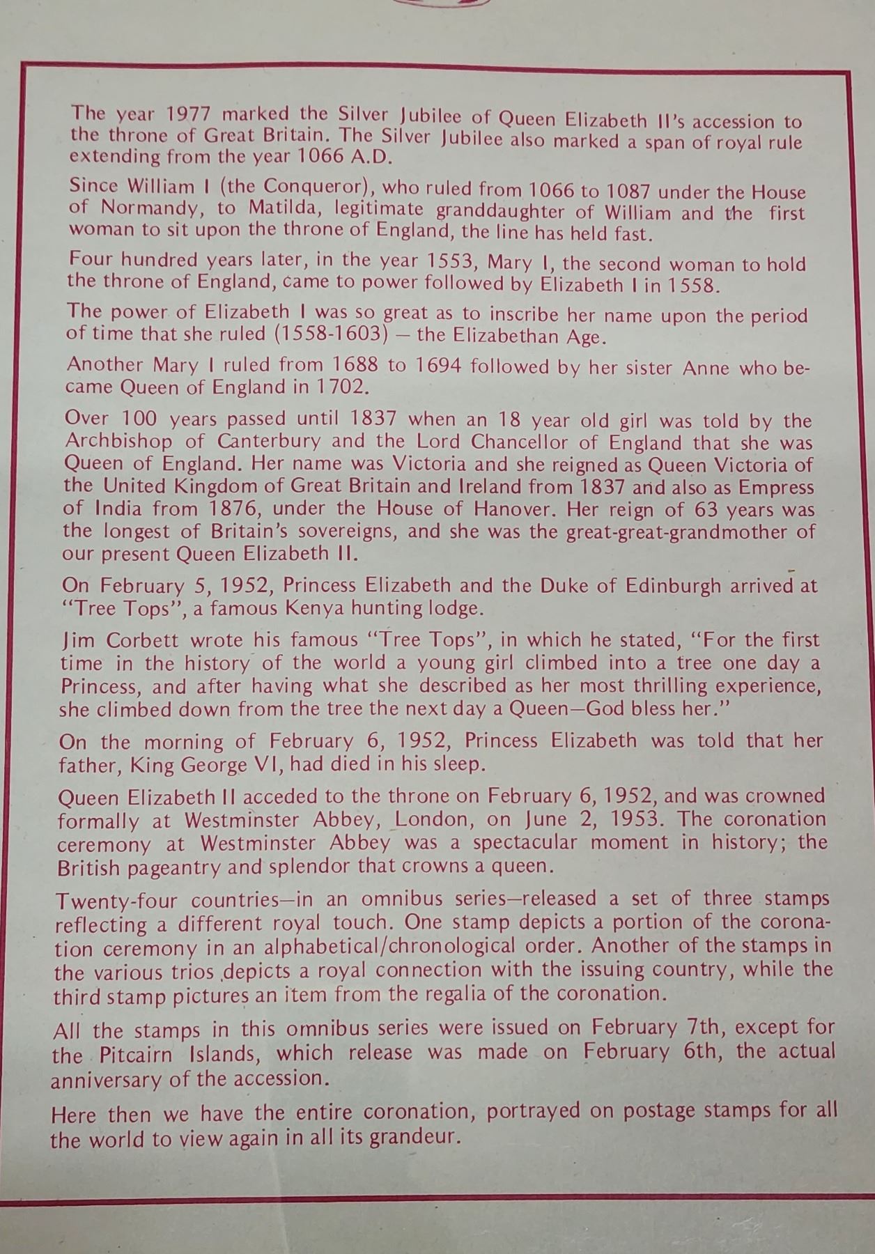 Queen Elizabeth II Silver Jubilee, Mint Stamp Collection, Countries A-G, Volume 1. Postage Stamps from various members of the British Commonwealth. Stamps were issued in 1977, mounted in a White Ace Album on pages.
