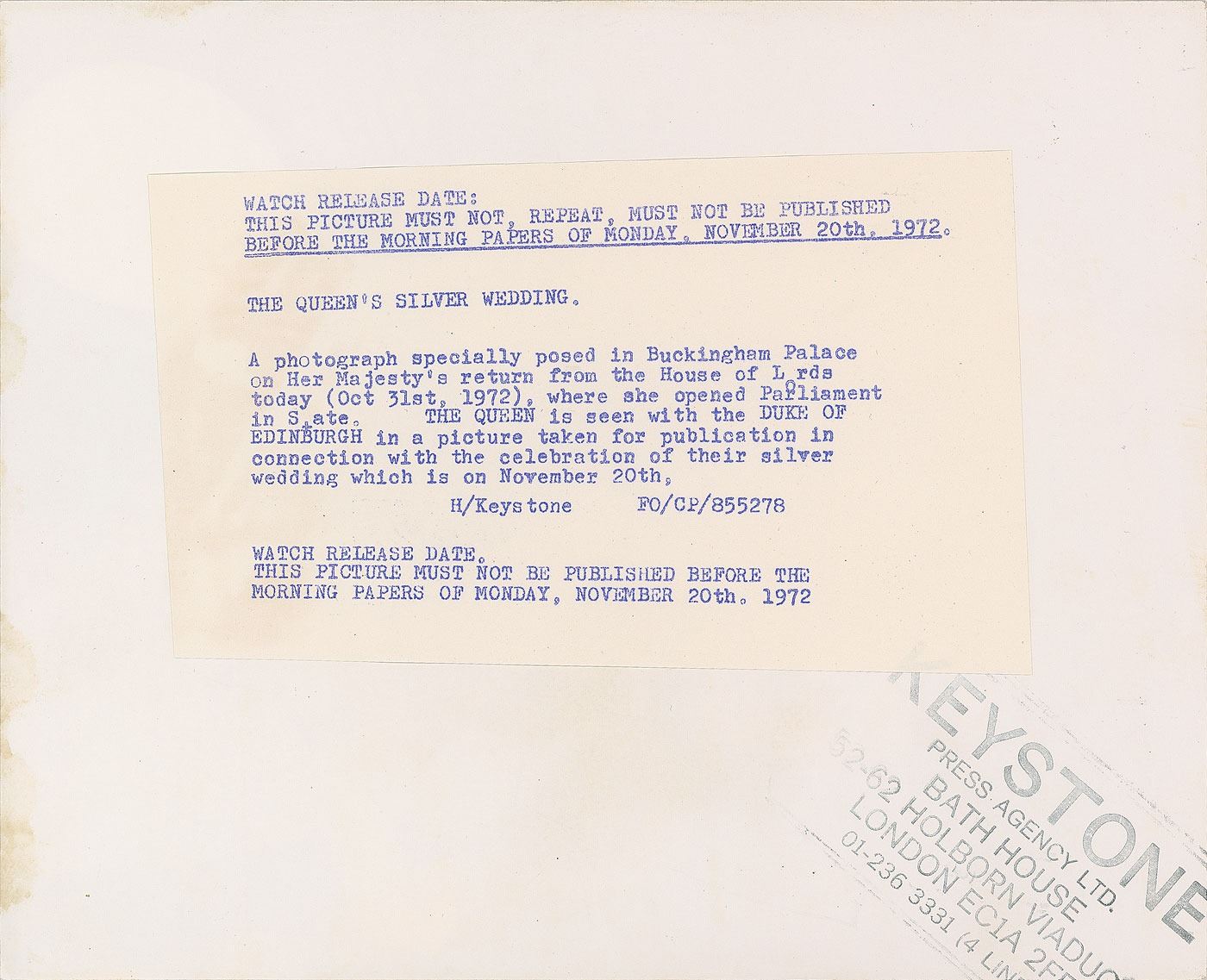 Lovely vintage glossy 8 x 10 silver gelatin photo of Queen Elizabeth and Prince Philip in Buckingham Palace, taken for publication in connection with the celebration of their silver wedding anniversary on November 20, 1972. Reverse bears an affixed caption and Keystone Press Agency credit stamp. In fine condition, with a bit of light creasing. From the Globe Photo archives.