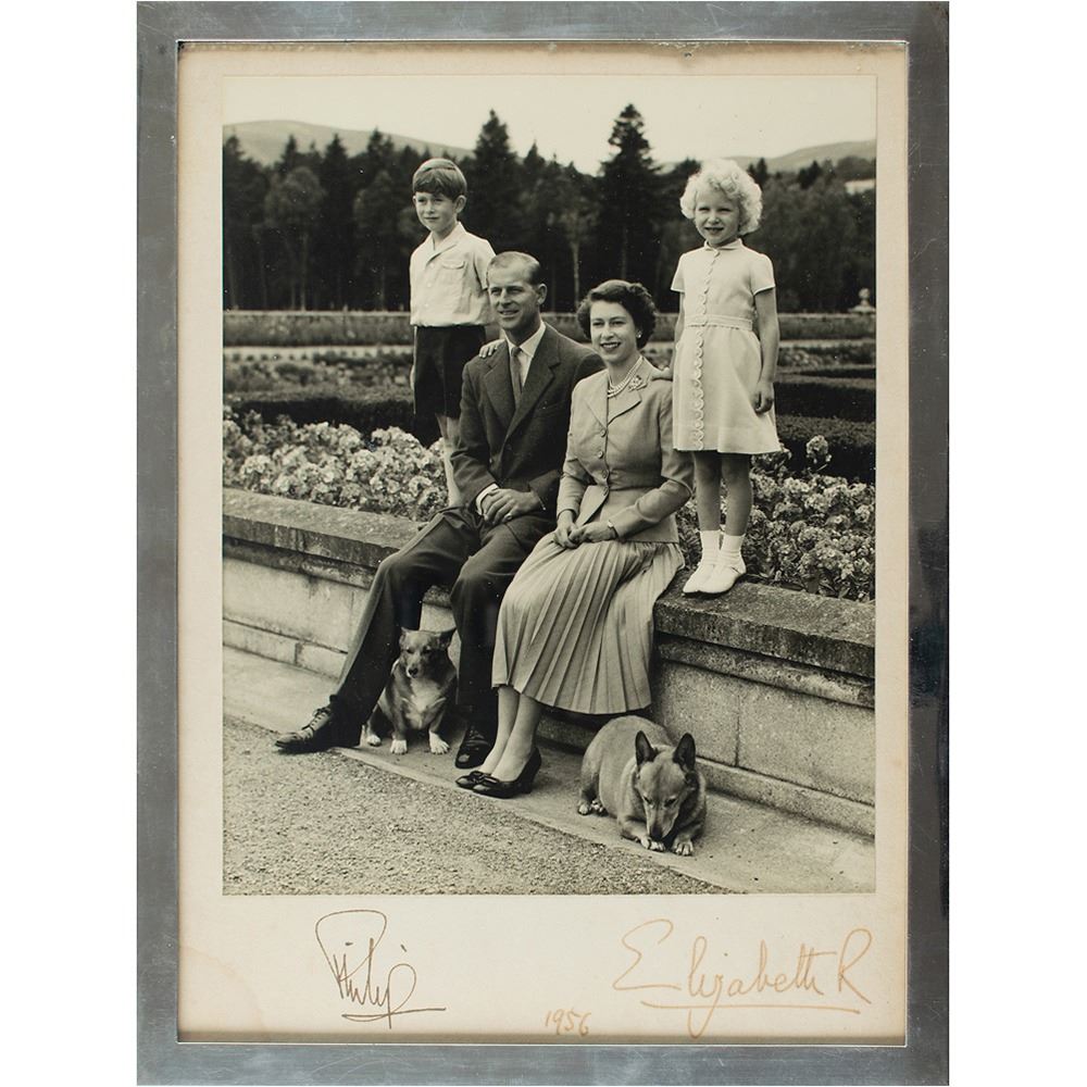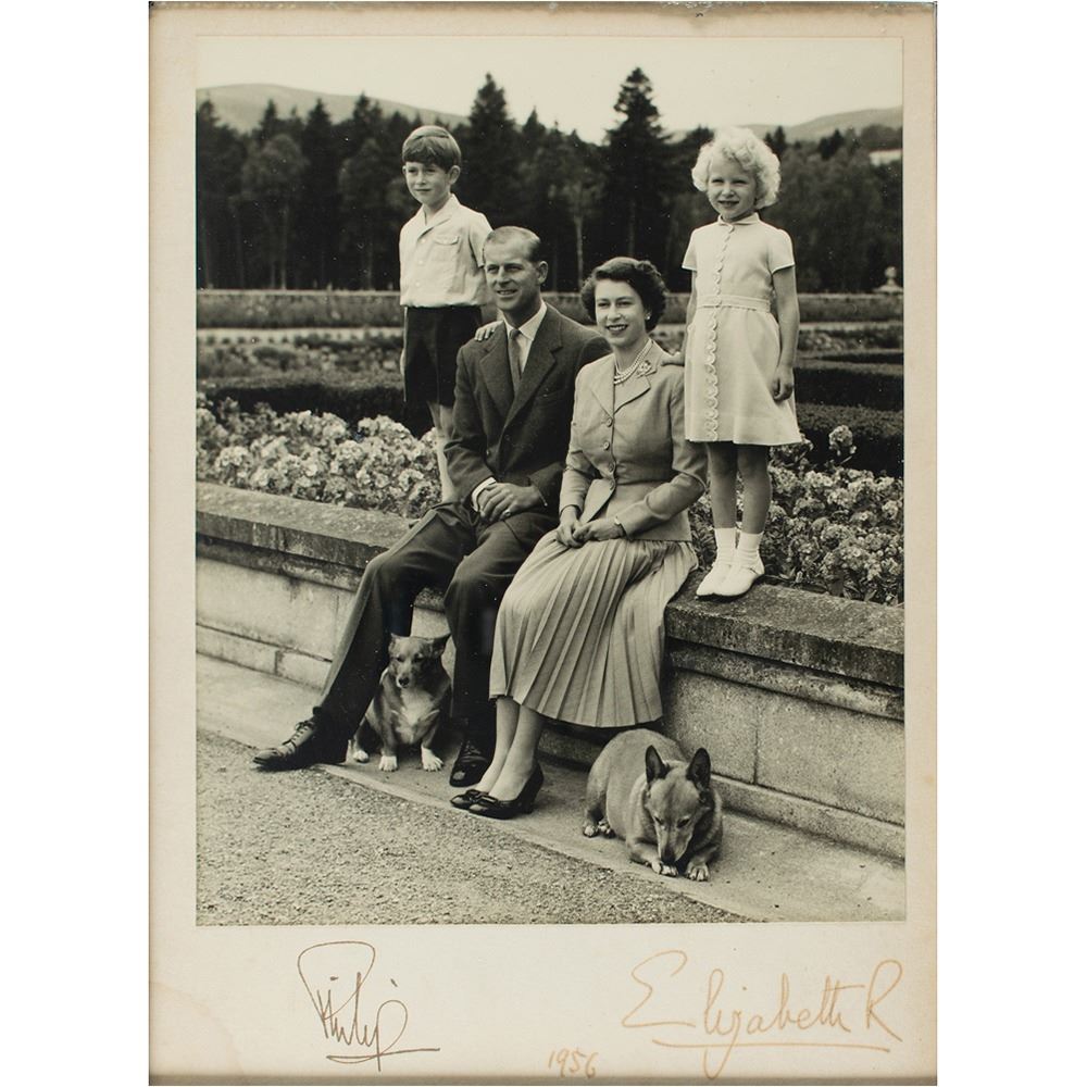 Vintage matte-finish 8 x 11 photo of Queen Elizabeth II and Prince Philip posing with their young children, Prince Charles and Princess Anne, and their two corgis, signed in the lower border in fountain pen, "Philip" and "Elizabeth R, 1956." Mounted and framed to an overall size of 9 x 12. In very good to fine condition, with a stain to the lower left corner, and some blurriness to Elizabeth's signature.