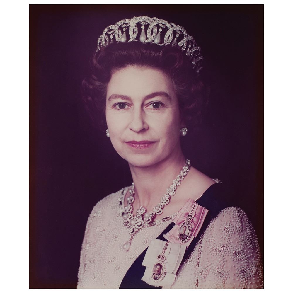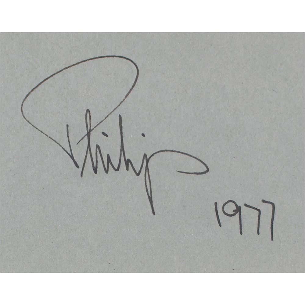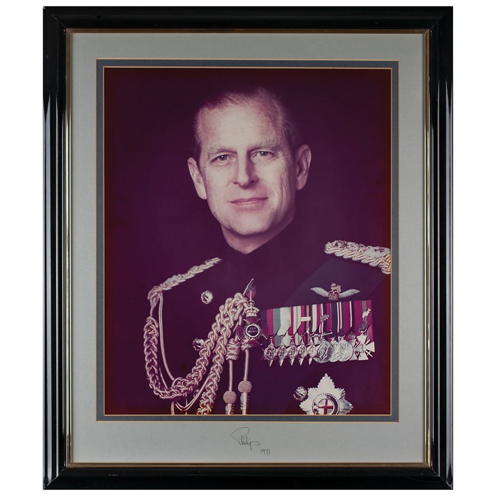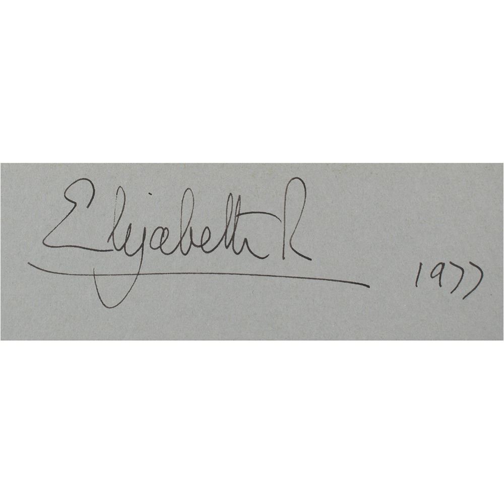 Huge matching color satin-finish 19 x 23 photographs of Queen Elizabeth II and Prince Philip, both presented in their original 23.5 x 28.5 mats, individually signed on the mats in fountain pen, "Elizabeth R, 1977" and "Philip, 1977." Individually framed to 27.25 x 32.25. In fine condition. Queen Elizabeth celebrated her Silver Jubilee in 1977, marking her 25th year on the United Kingdom's throne. An exceptionally impressive, desirable pairing of magnificent portraits.