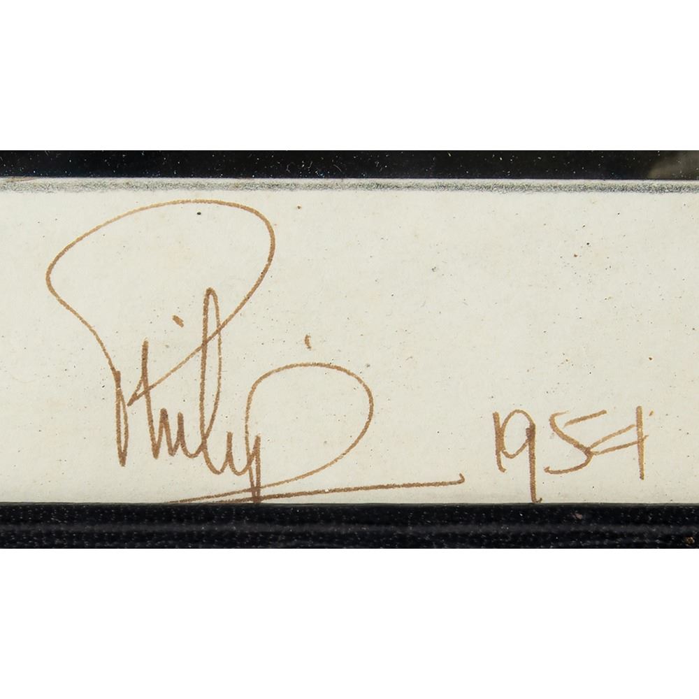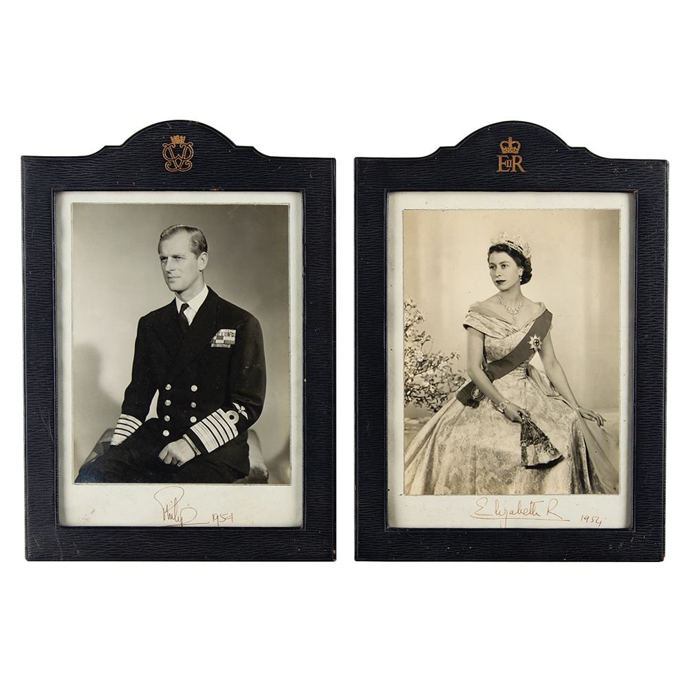 Exquisite pair of vintage matte-finish portraits of Queen Elizabeth II and Prince Philip: the Elizabeth photo by Dorothy Wilding shows the queen seated and wearing a strapless dress with the Riband and Star of the Order of the Garter, a Lesser George at the waist, and the Diamond Diadem crown, signed on the original 7 x 9.5 studio mount in fountain pen, "Elizabeth R, 1954"; the Philip photo by Baron Studios (Sterling Henry Nahum) portrays the prince in a handsome seated pose attired in his Admiral of the Fleet uniform, signed on the original 7 x 9.5 studio mount in fountain pen, "Philip, 1954." Both are in their original leather presentation frames by H. H. Plante of London, with handsome gilt-stamped royal crests at the top; both backings are missing their easel-style stands, with one detached stand included. In fine condition, with some light silvering to the edges of the Philip image.