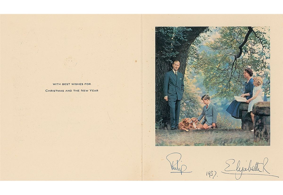 Christmas card from 1957, measuring 7.75 x 9.25 closed, with embossed seals from the House of Windsor on the front. Inside bears a color 6.25 x 6.25 image of the royal family posing together under a tree with their pet Welsh Corgies. Printed opposite the